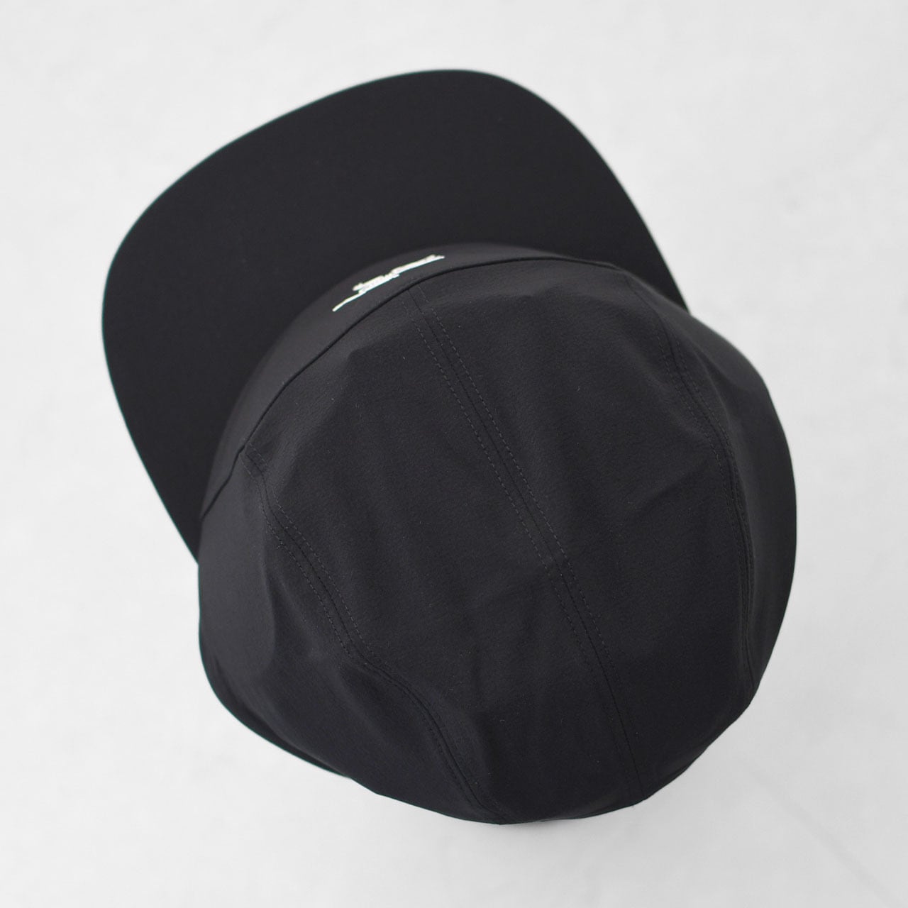 通気性と伸縮性を備えたソフトシェル素材の5パネルキャップ。