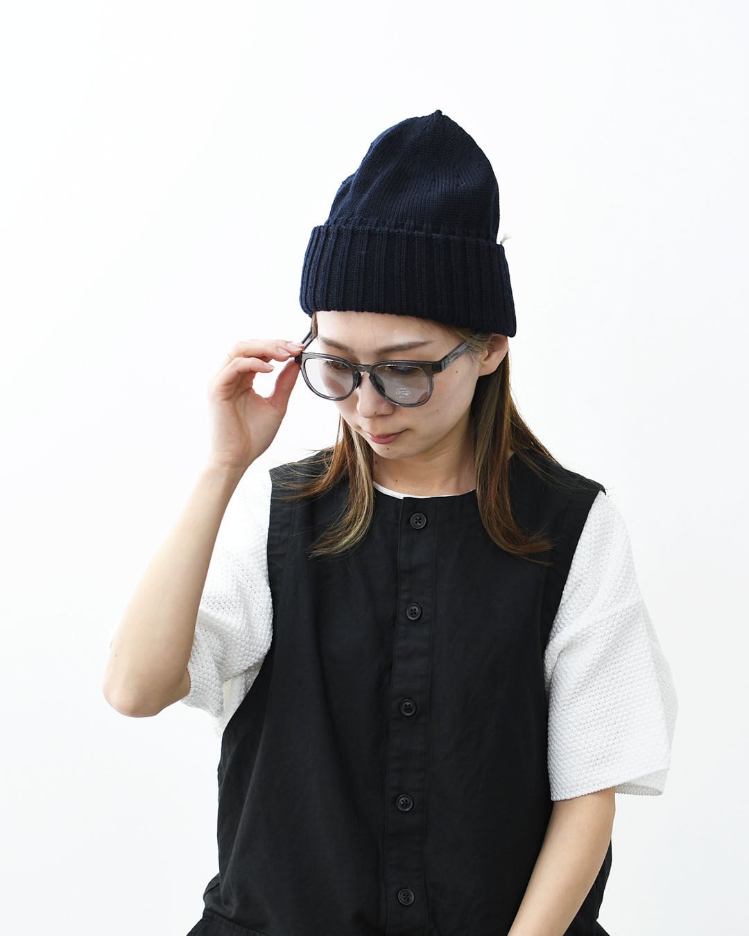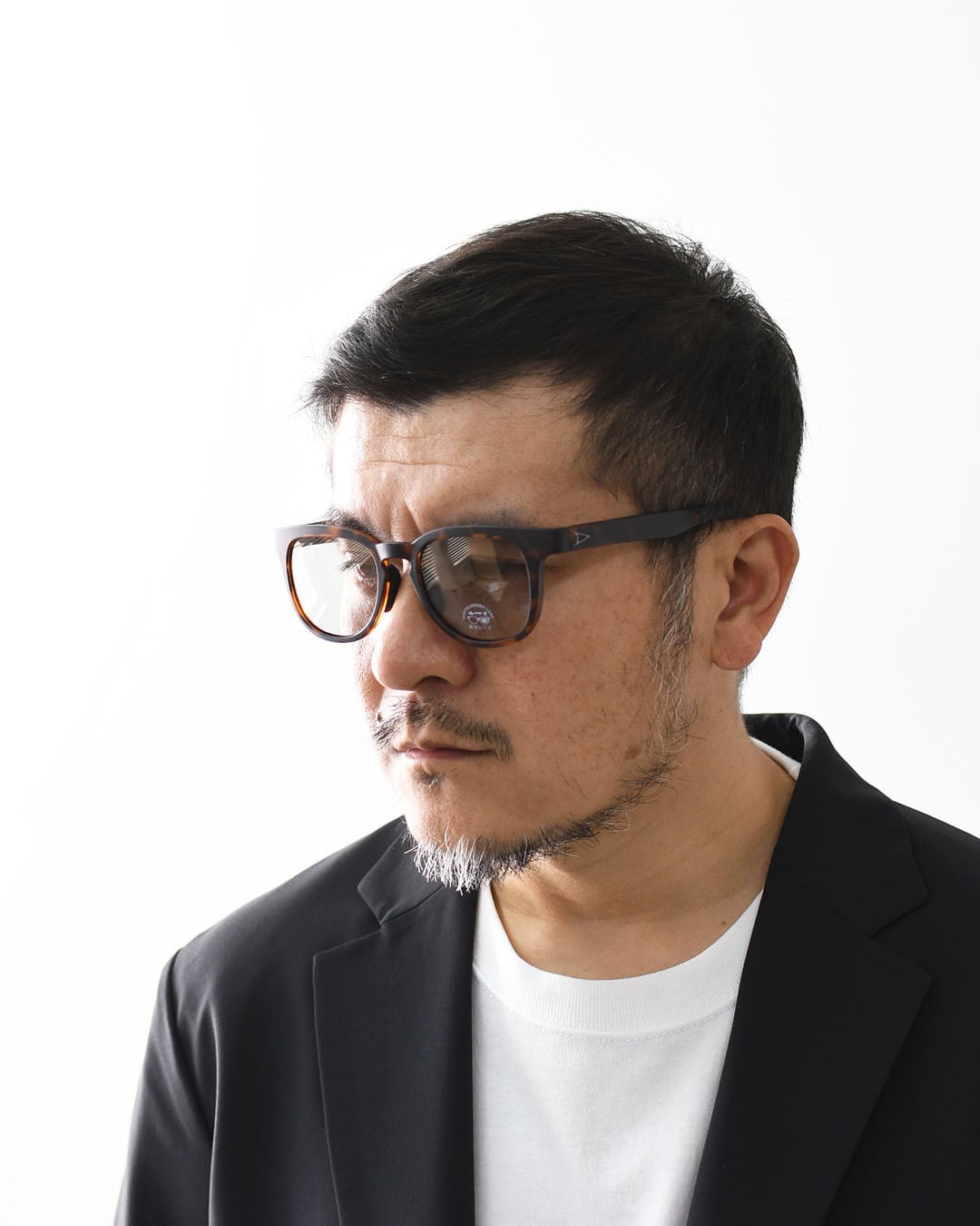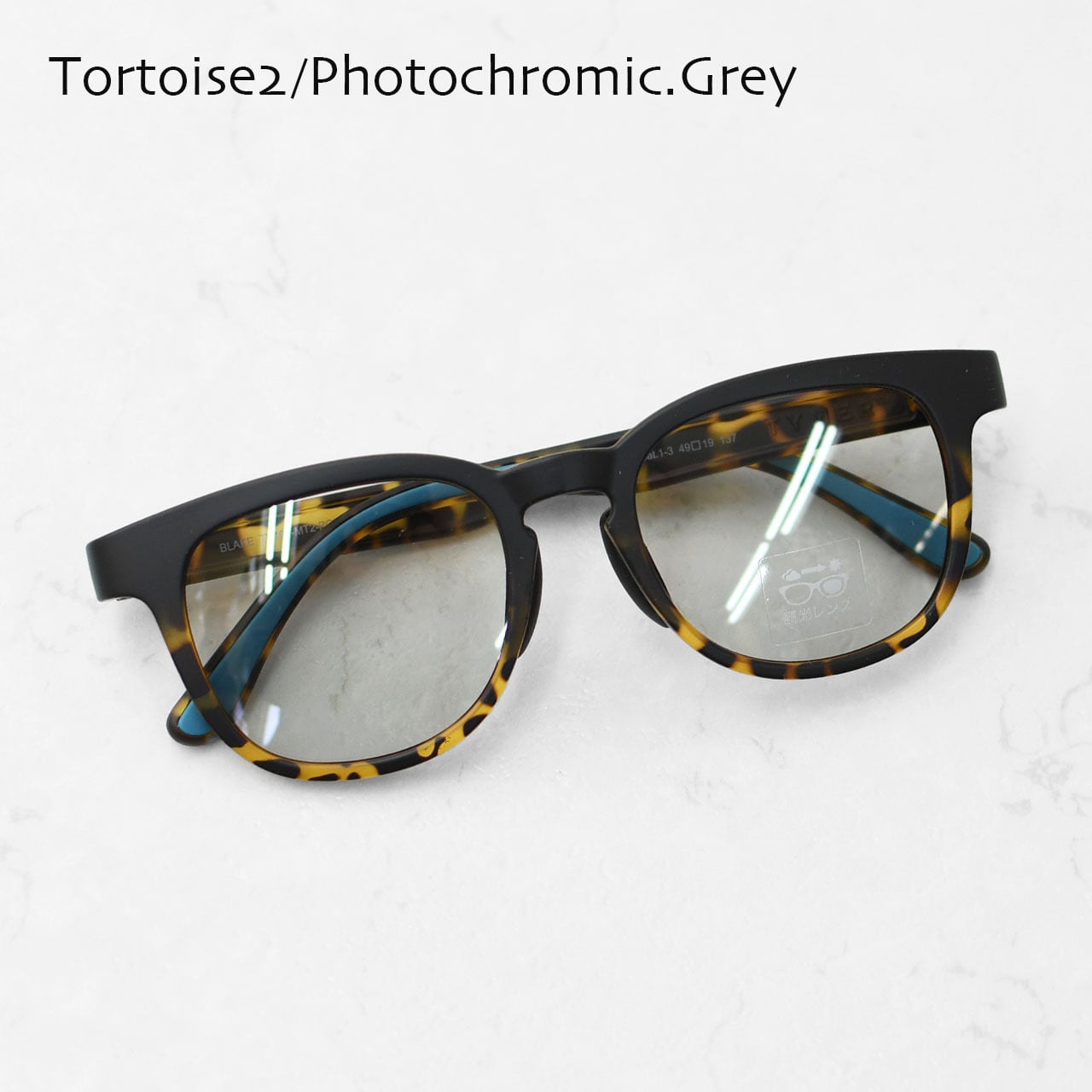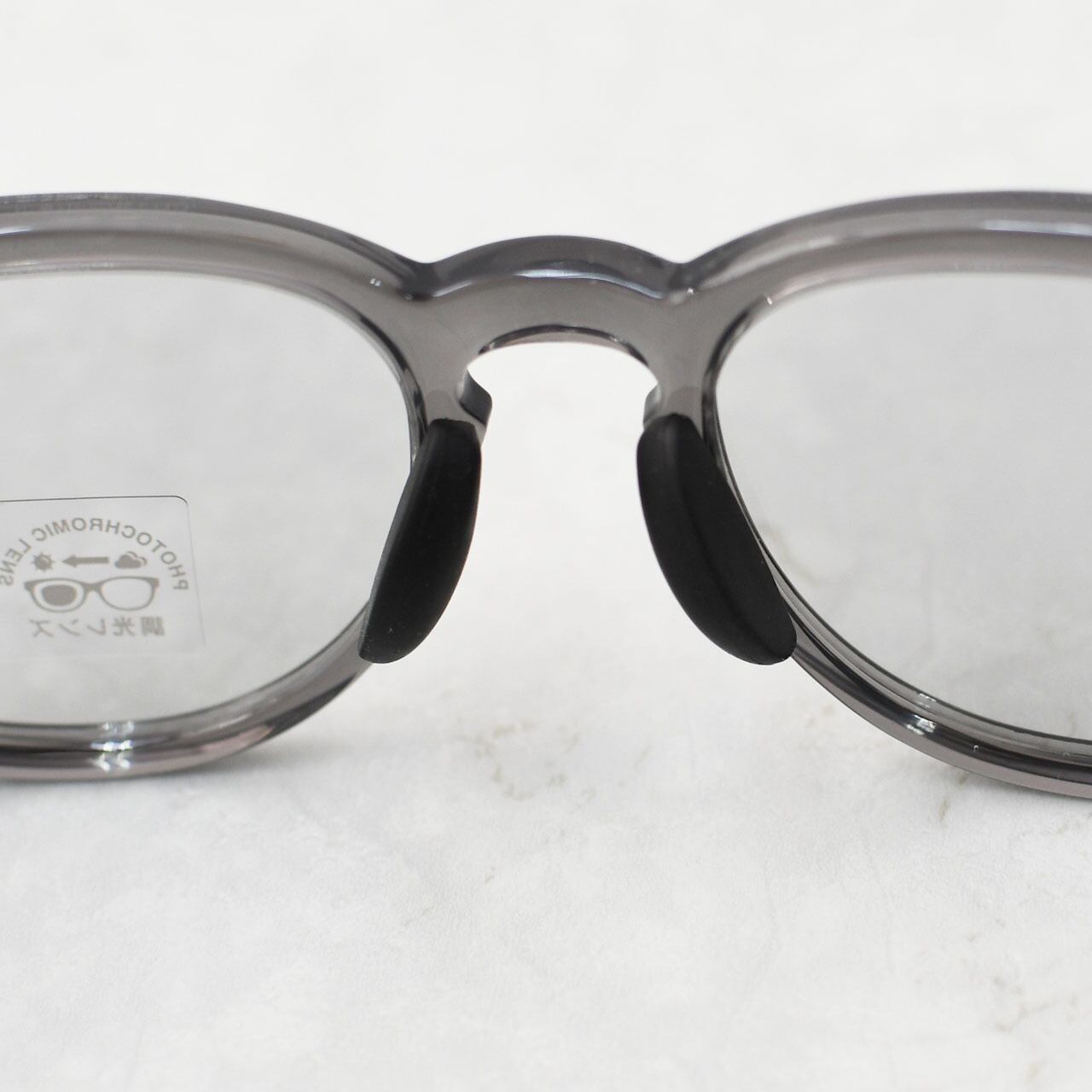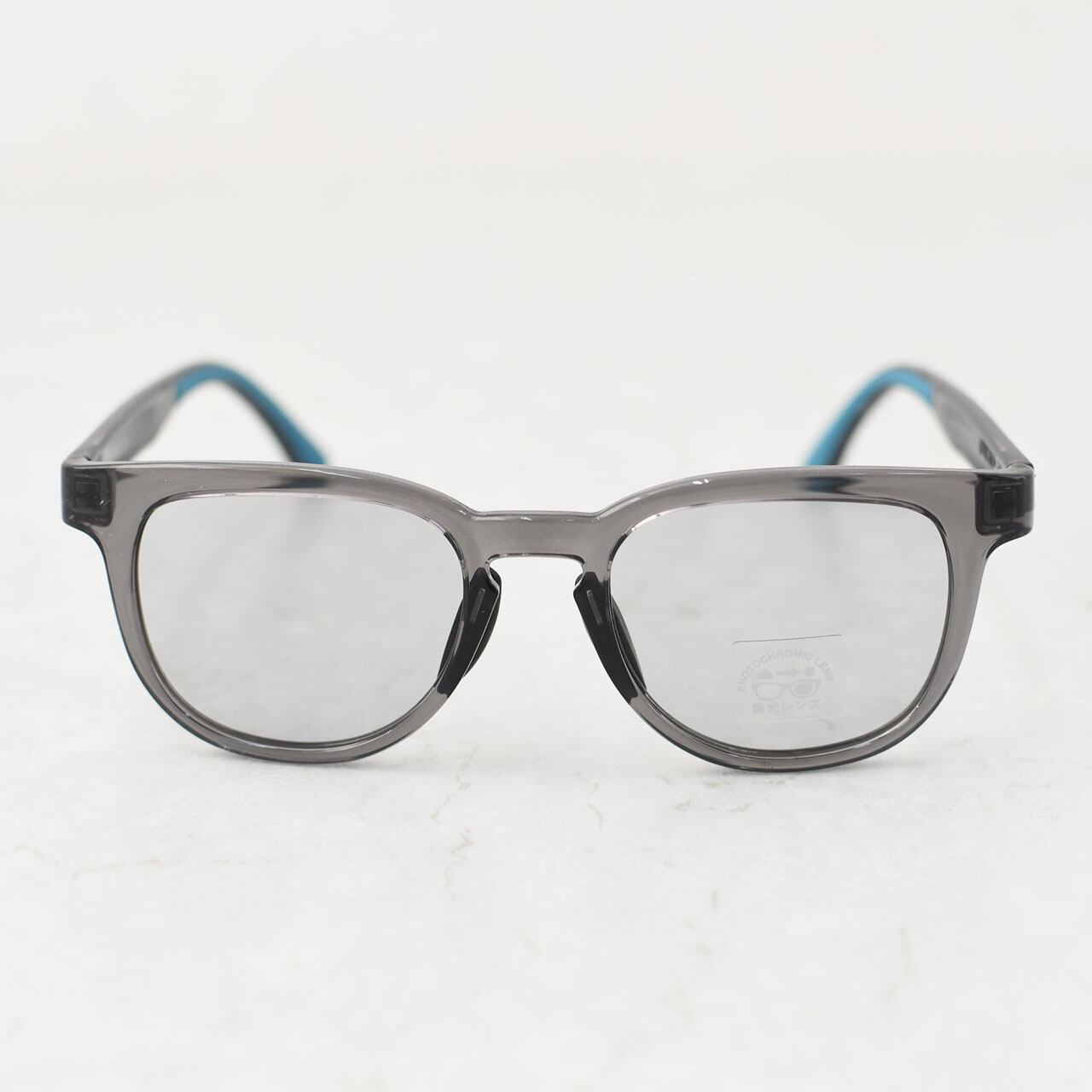 レンズは紫外線量によって色が変わる調光タイプで、外でも室内でも自然にフィット。