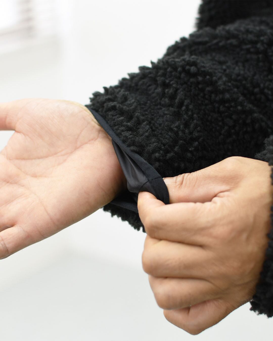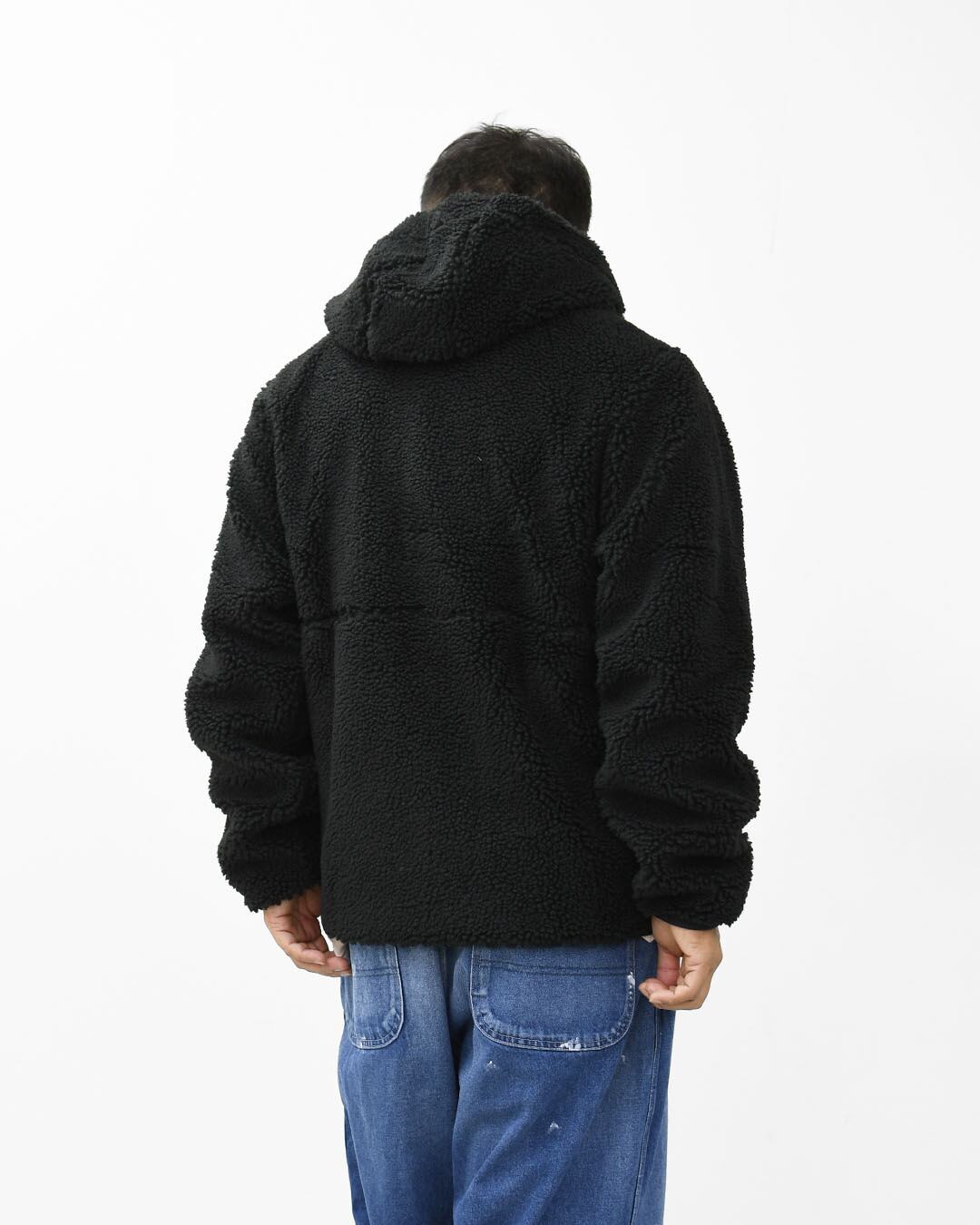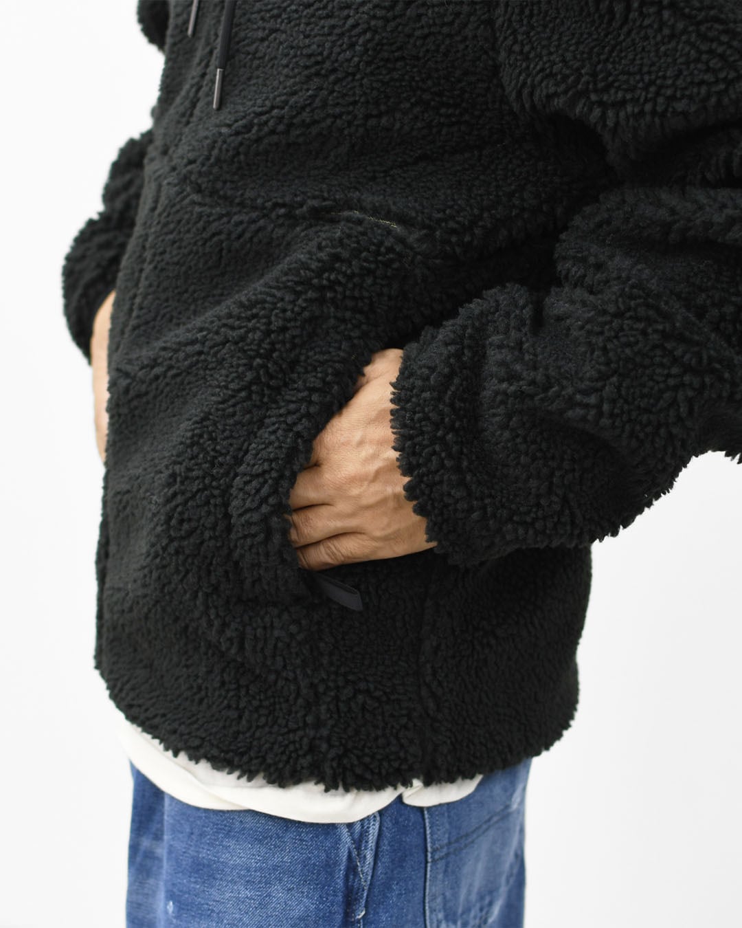 プラスチック汚染の危機にさらされている沿岸部の共同体から供給された、オーシャンサイクルの認証済みのリプリーブ・リサイクル・ポリエステル100%の6ミリ厚パイル・フリースで作ったソフトで温かい防風性フード付きジャケット。裏地はリサイクル・ポリエステル100%のタフタで、PFASを意図的に使用せずに製造されたDWR(耐久性撥水)加工済み