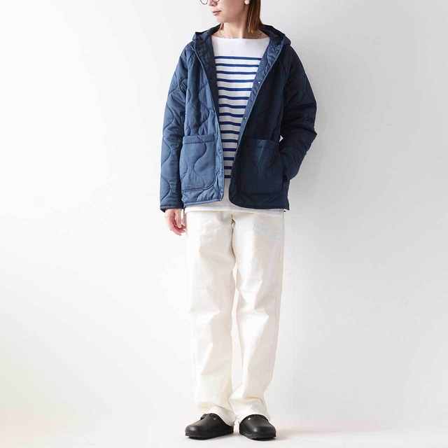 フード、フロント中央、裾、袖口に共布の縁取りを施した、フロントがスナップ留めで着用しやすいフーディ。80グラム・サーモグリーン・リサイクル・ポリエステル100%のインサレーション入り