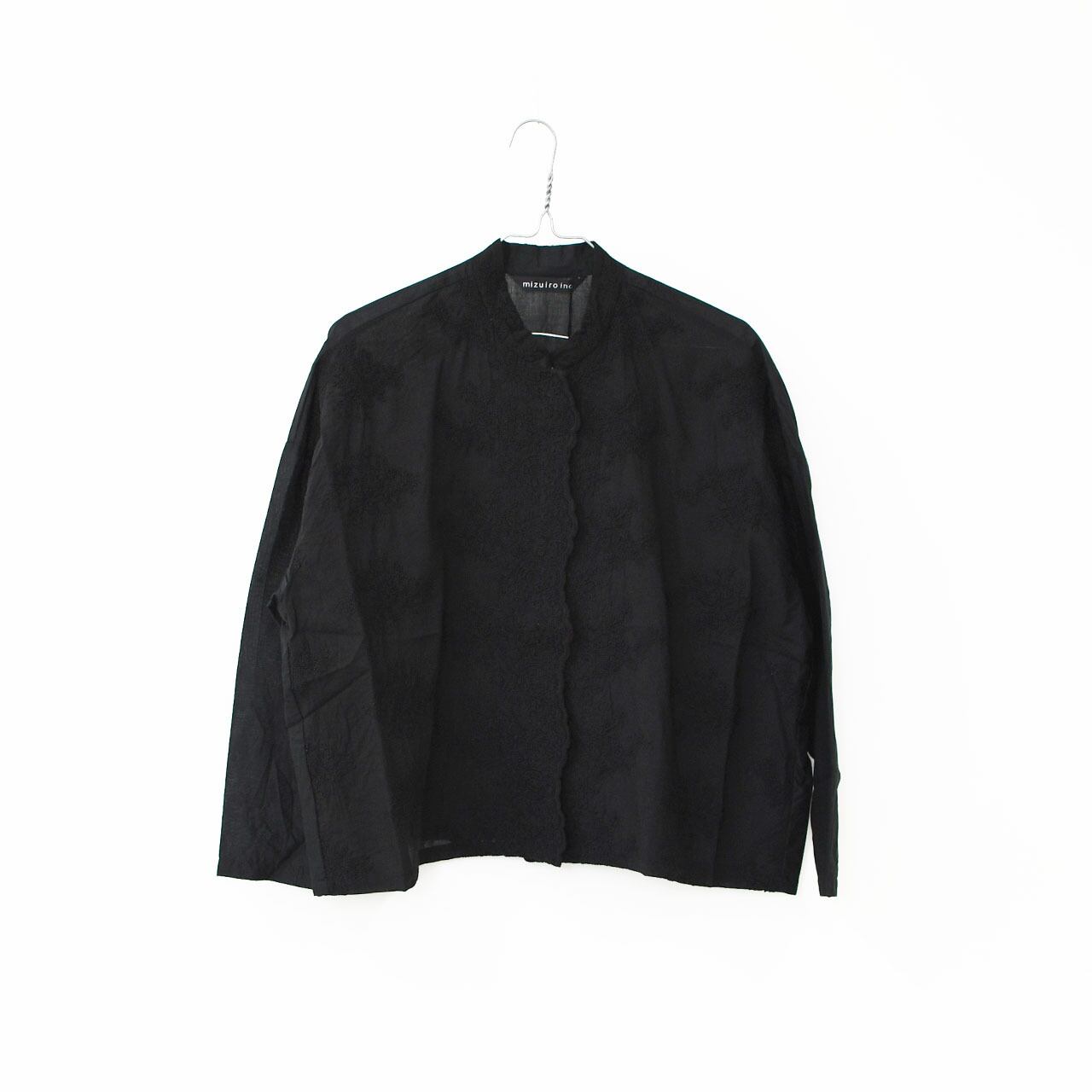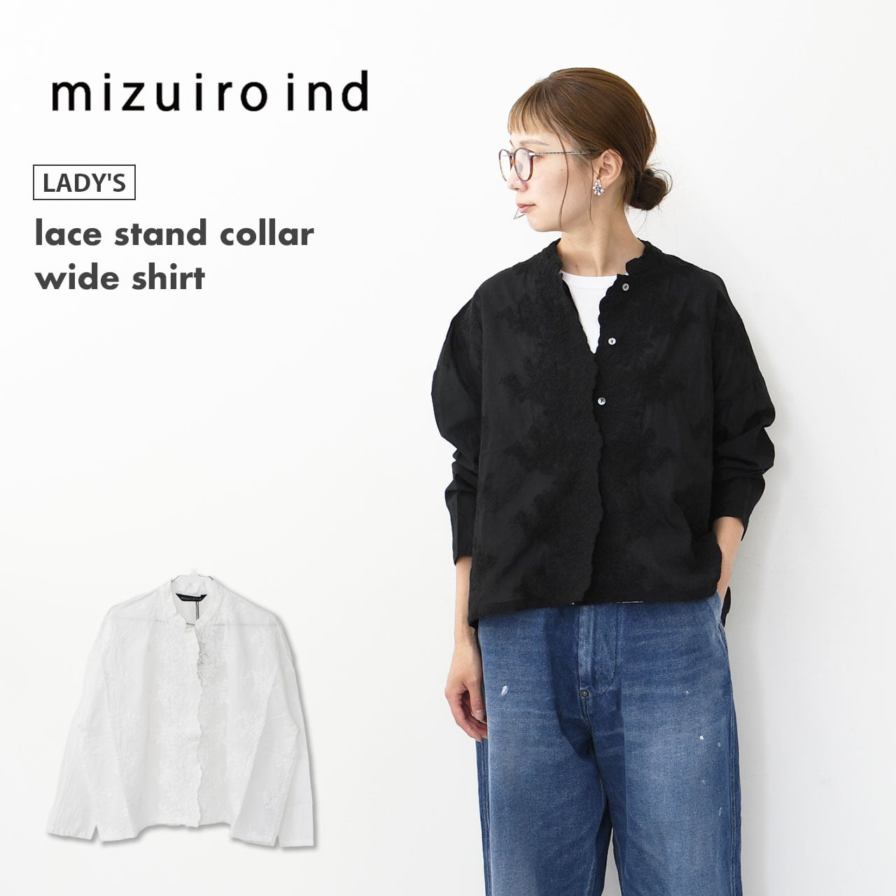 mizuiro ind [ミズイロ インド] lace stand collar wide shirt [1-239005] レーススタンドカラーワイドシャツ・コットンシャツ・スタンドカラー・長袖・無地・レース調・シンプル・キレイめ・フォーマル・LADY'S [2025AW]