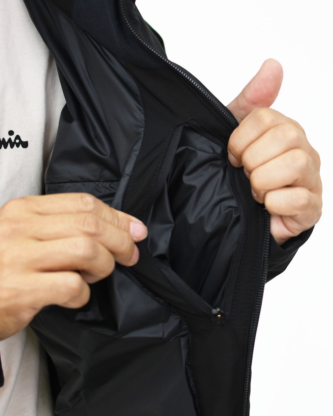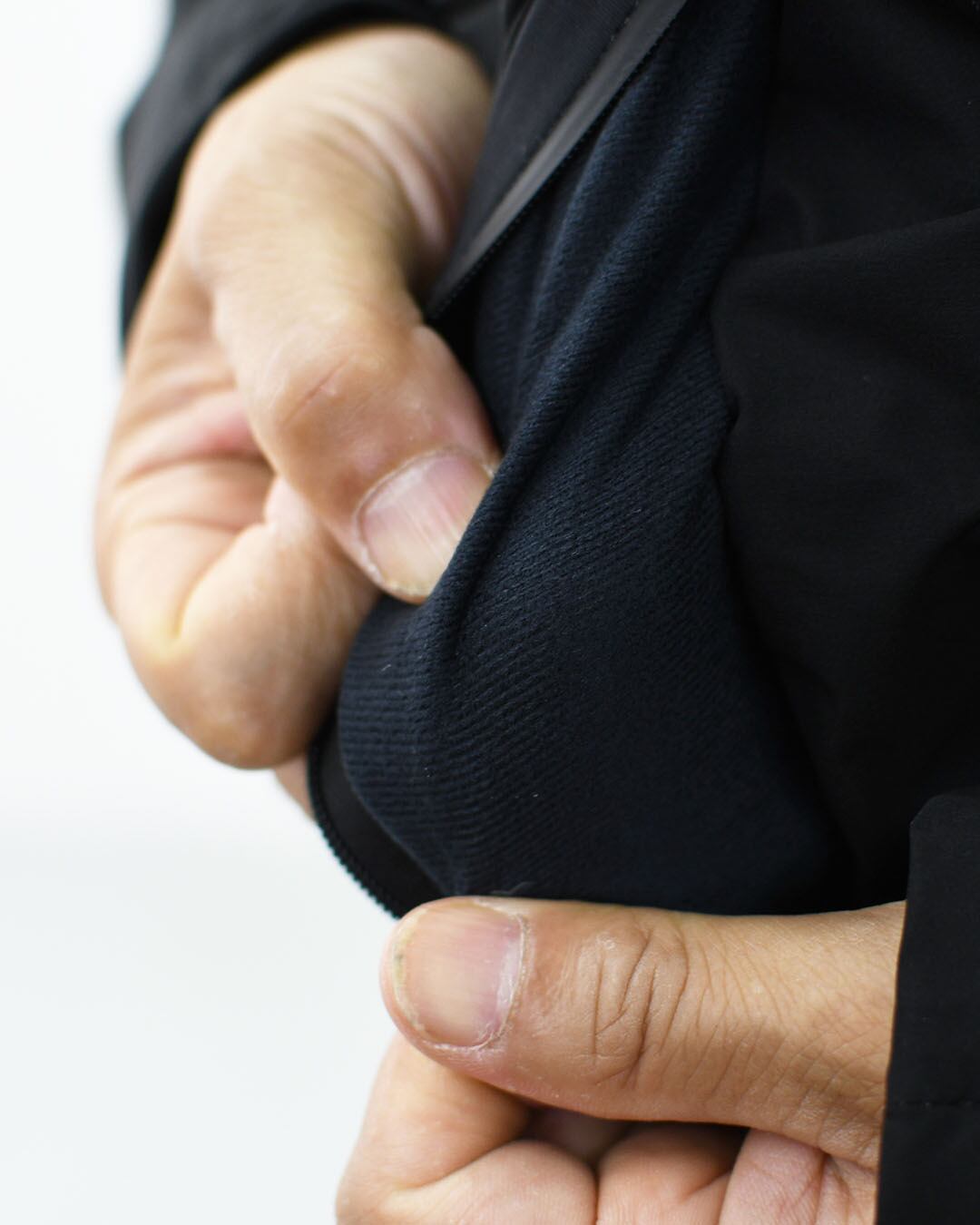 フロントジッパー部分に採用されたデュアルジップベンチレーションは、2列のジッパーとその間に配置されたメッシュ生地により衣服内に外気を取り込み、ジャケット内にこもりやすい不快な熱や湿気を逃がすことが可能。