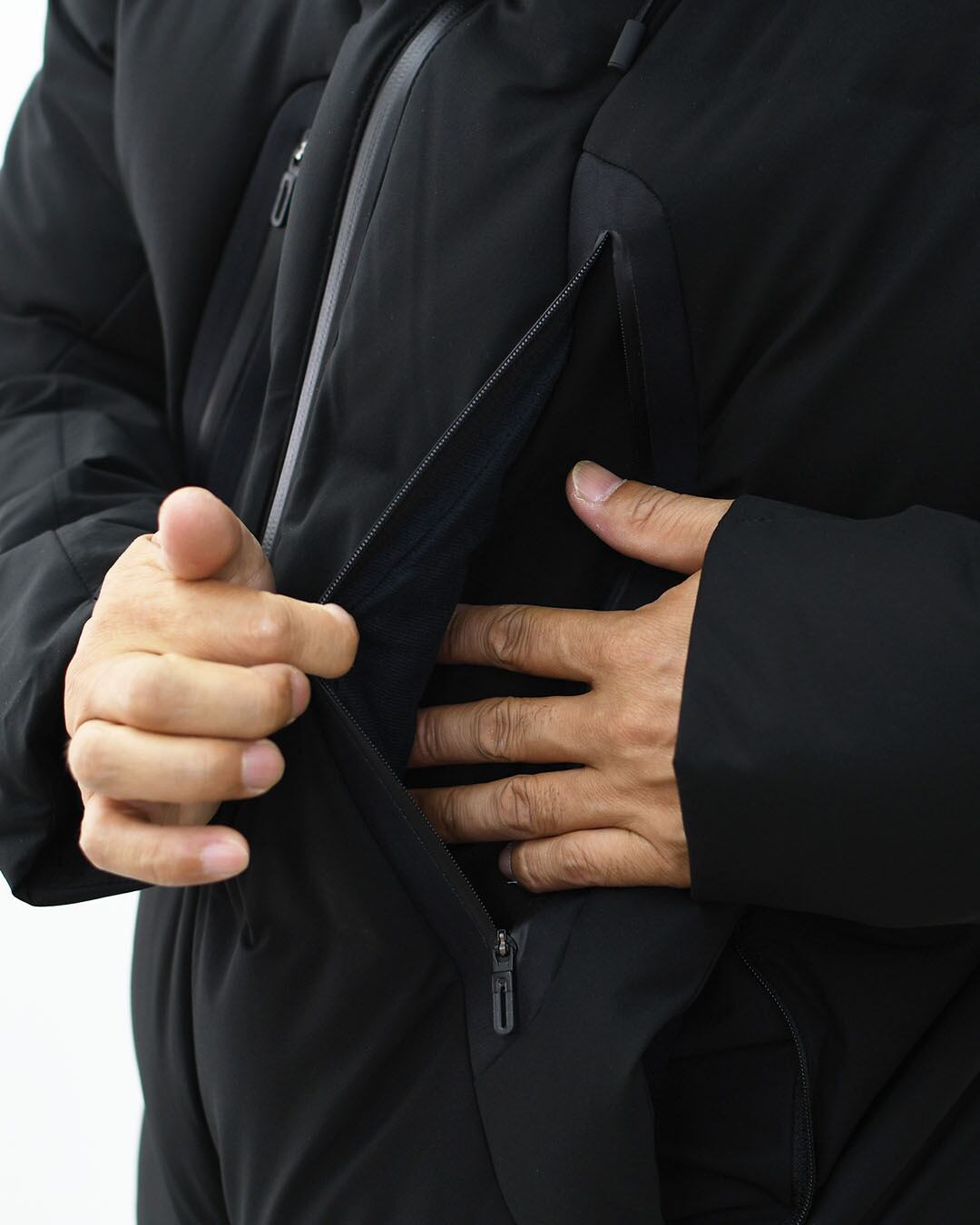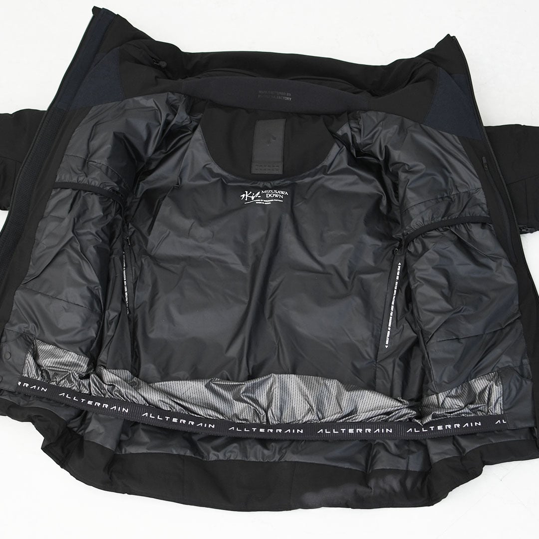 機能:耐水性 (20,000mm)/透湿性 (10,000g/㎡/24hr)(B-1法)/はっ水/防風/保温/パラフードシステム/デュアルジップベンチレーション/ダウンパストレーサビリティシステム