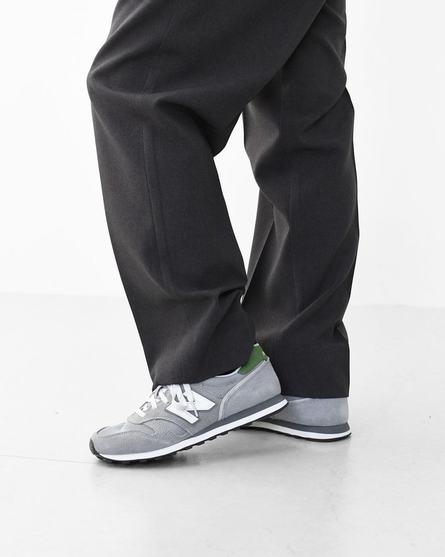 スエードとメッシュのアッパーで上品さを保ちつつ、落ち着いたグレー×ホワイトのカラーリングが特徴です。