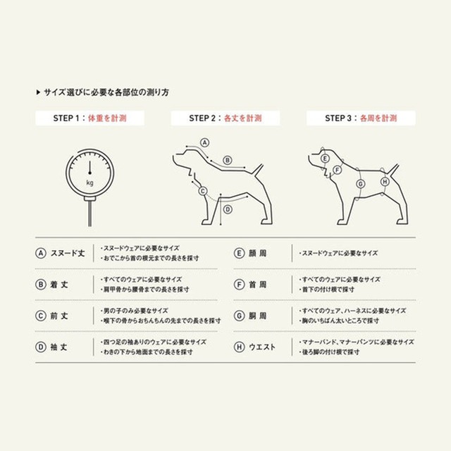 SIZE - 体重 / 首周 / 胴周 / 着丈 / 前丈 / 袖丈
