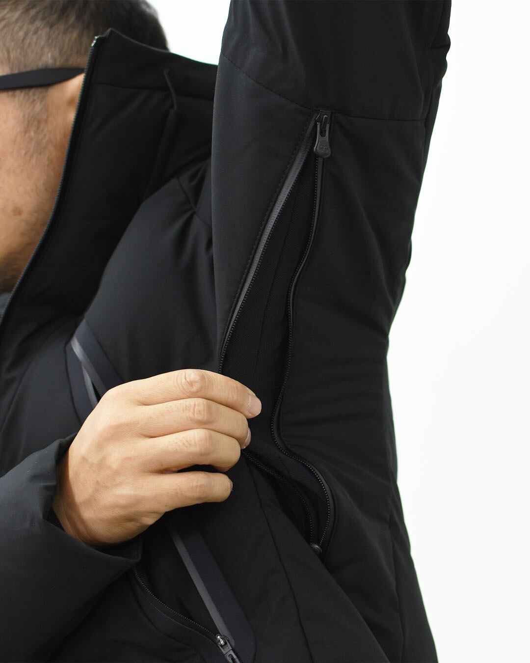 フロントジッパー部分に採用されたデュアルジップベンチレーションは、2列のジッパーとその間に配置されたメッシュ生地により衣服内に外気を取り込み、ジャケット内にこもりやすい不快な熱や湿気を逃がすことが可能。