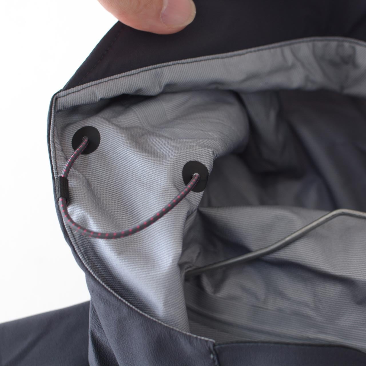 バックパックと干渉するショルダーエリアに一切シームテープが存在しないラグラン構造や、
