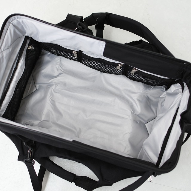 両サイドには圧縮ストラップ、内側にはオーガナイザーポケットや小物ポケット、キーフック付きトップポケット、パドロック対応ファスナーなどの機能も充実しています。