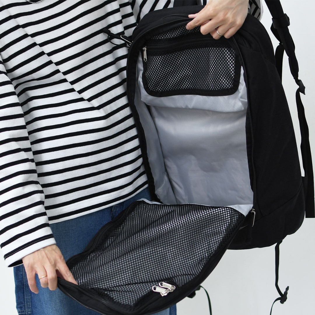 3辺を大きく開くメインコンパートメントには2分割できるメッシュパネルとセキュリティポケットが配置される。