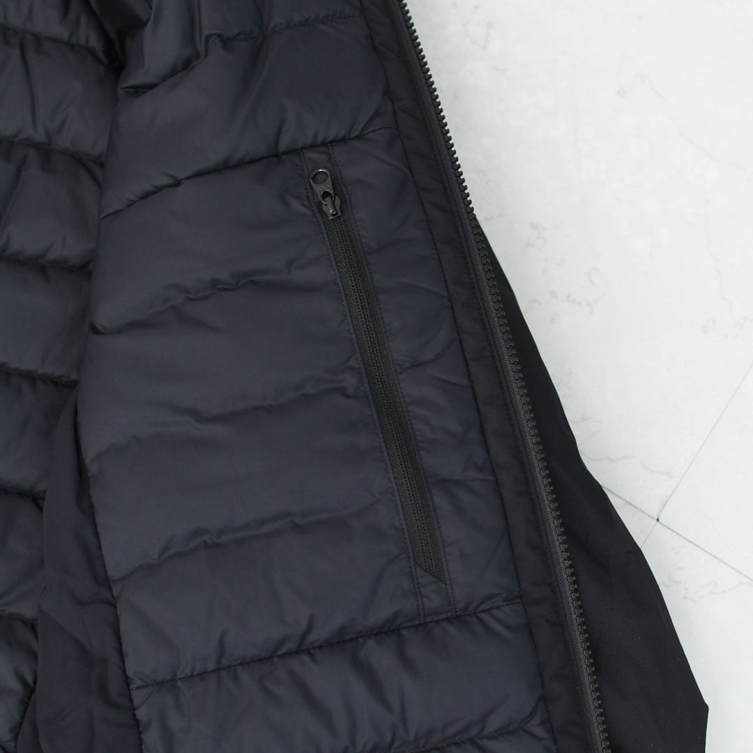 素材 本体:ポリエステル100% 別布:ナイロン86%、ポリウレタン14% 中わた:ダウン90%、フェザー10% パッド部:ポリエステル100% 裏地1:ナイロン100% 裏地2:ナイロン88%、ポリウレタン12%