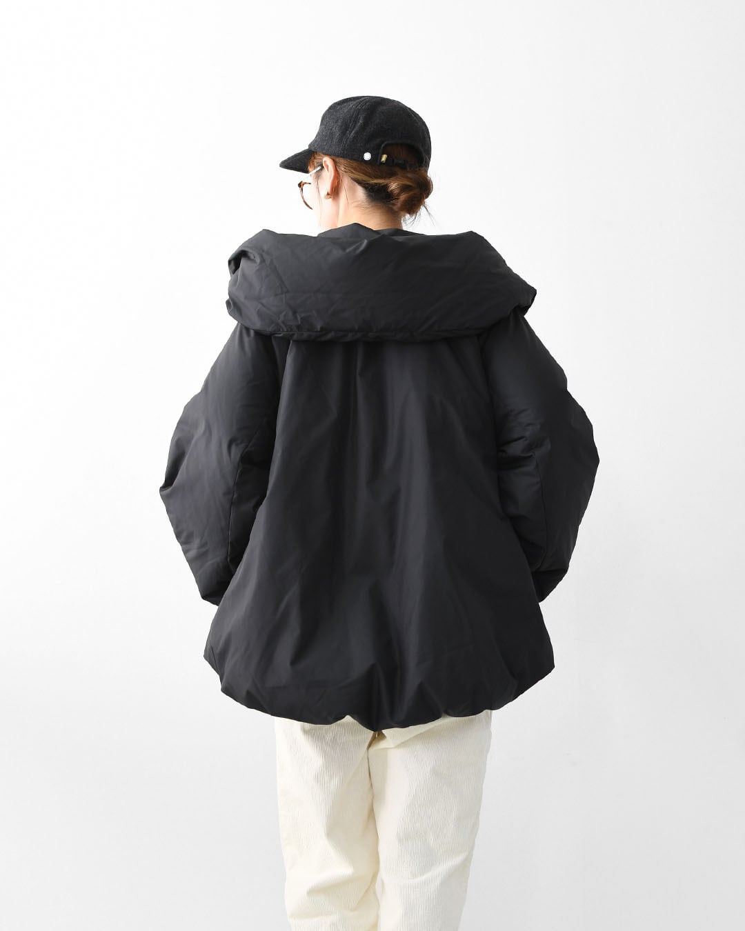スナップボタン仕様で、指先が冷える季節でも留めやすく、 小柄な方でもバランスよく着られる丈感。