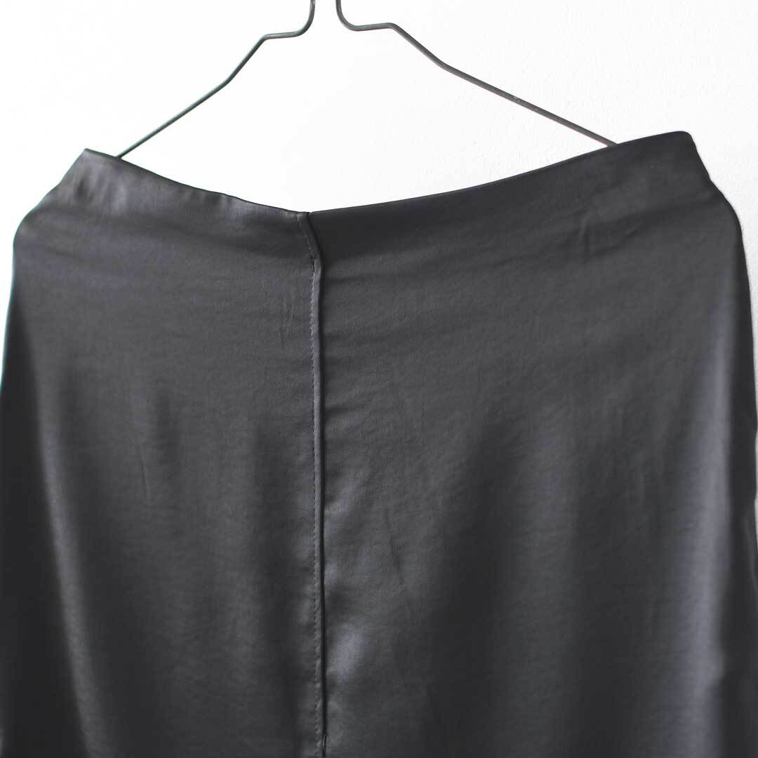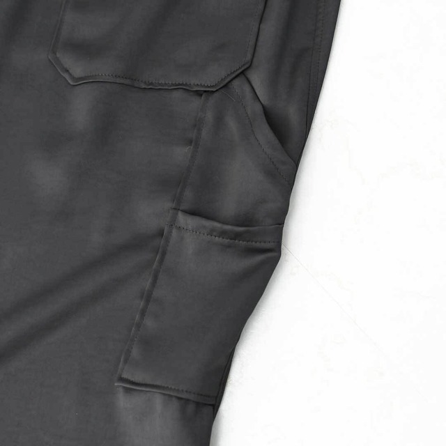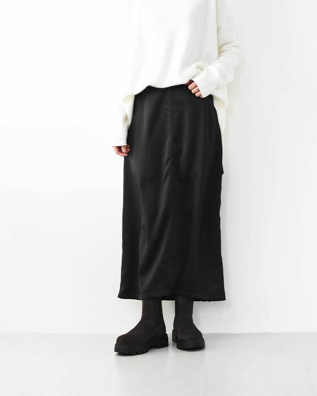 上品な光沢のあるサテン生地に、ペインターパンツのディテールを取り入れたタイトスカート。