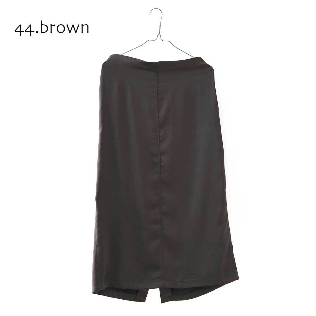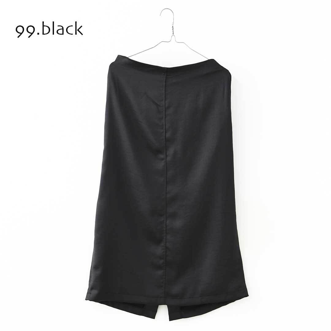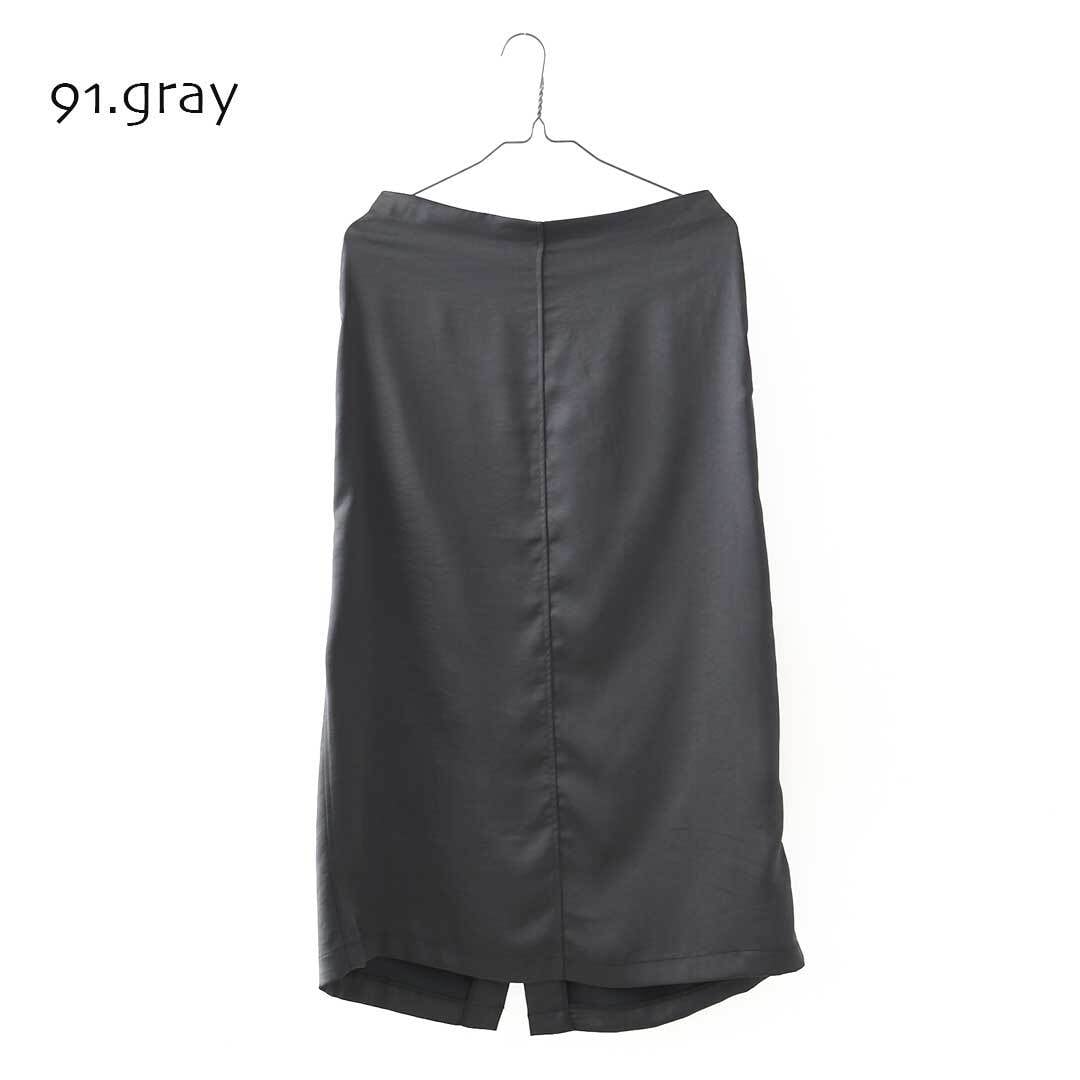 上品な光沢のあるサテン生地に、ペインターパンツのディテールを取り入れたタイトスカート。