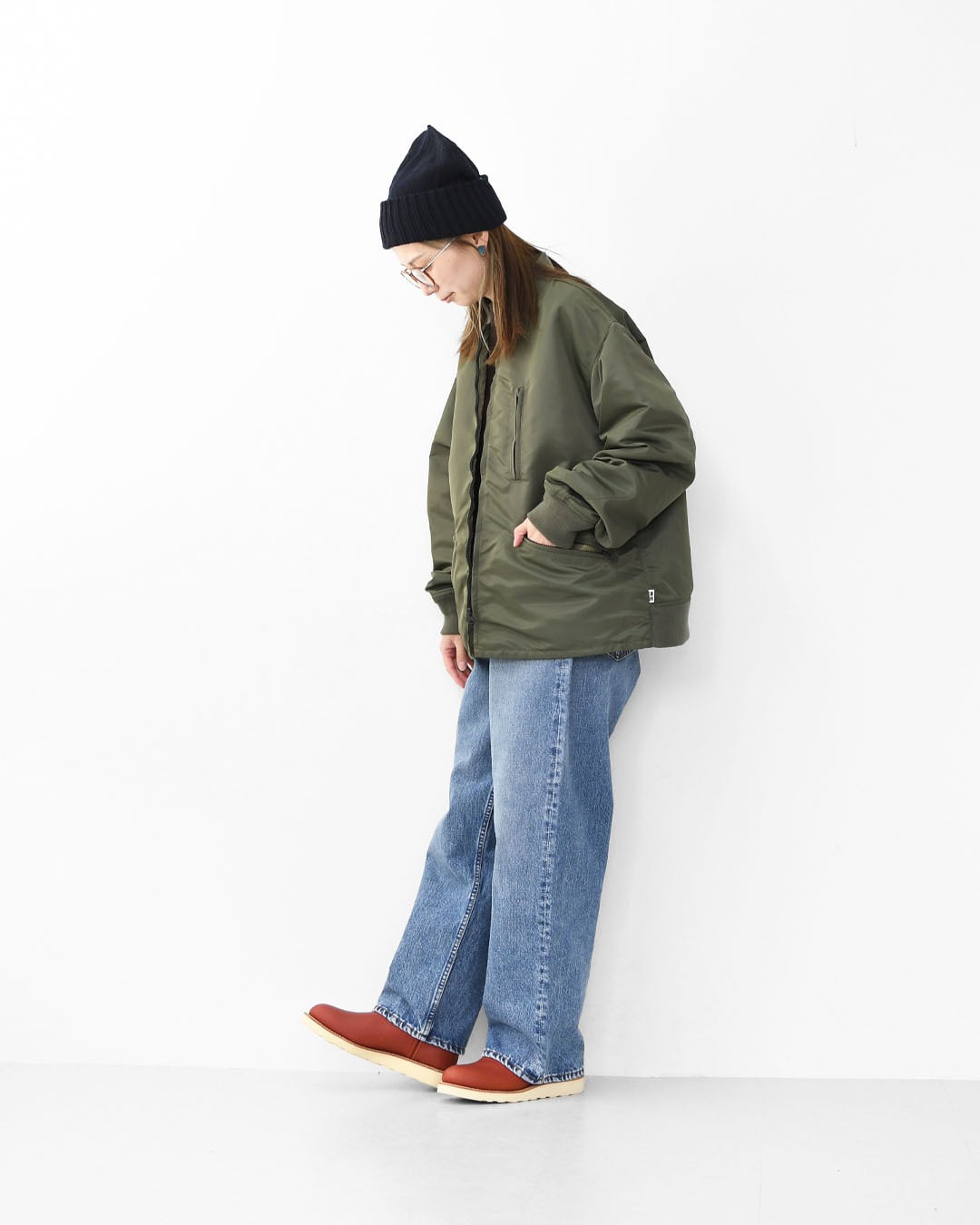 モノトーンコーデに合わせれば、後ろ身頃のリブやダブルジップのアクセントがさりげなく映えます。
