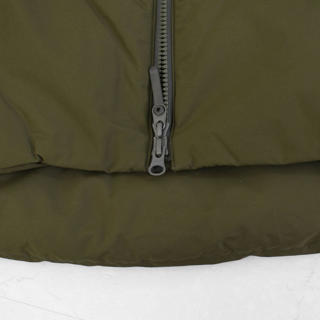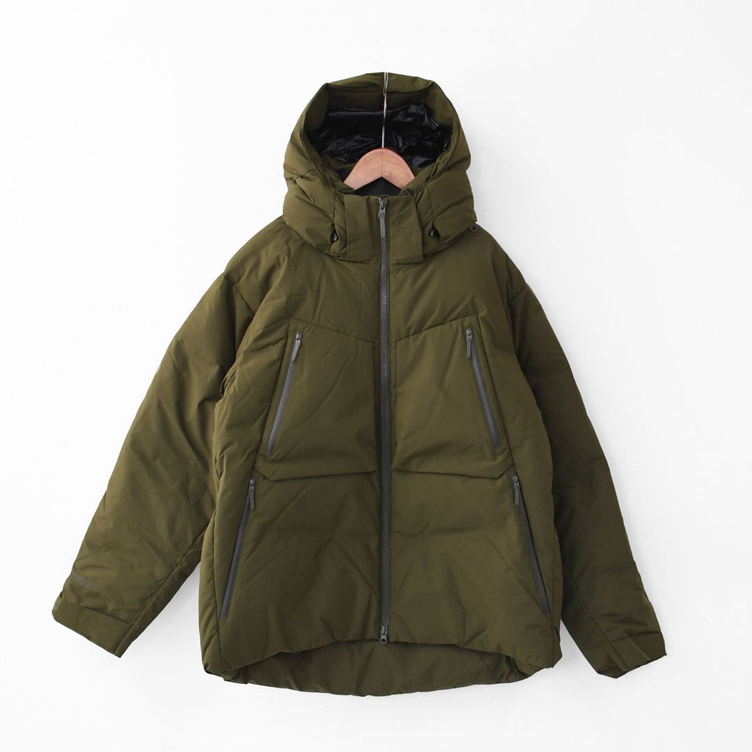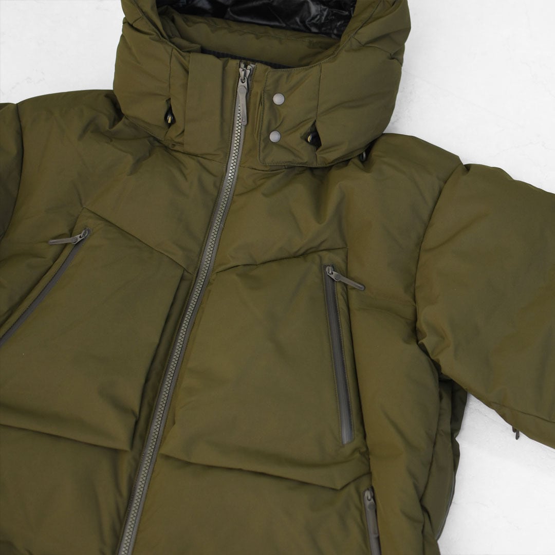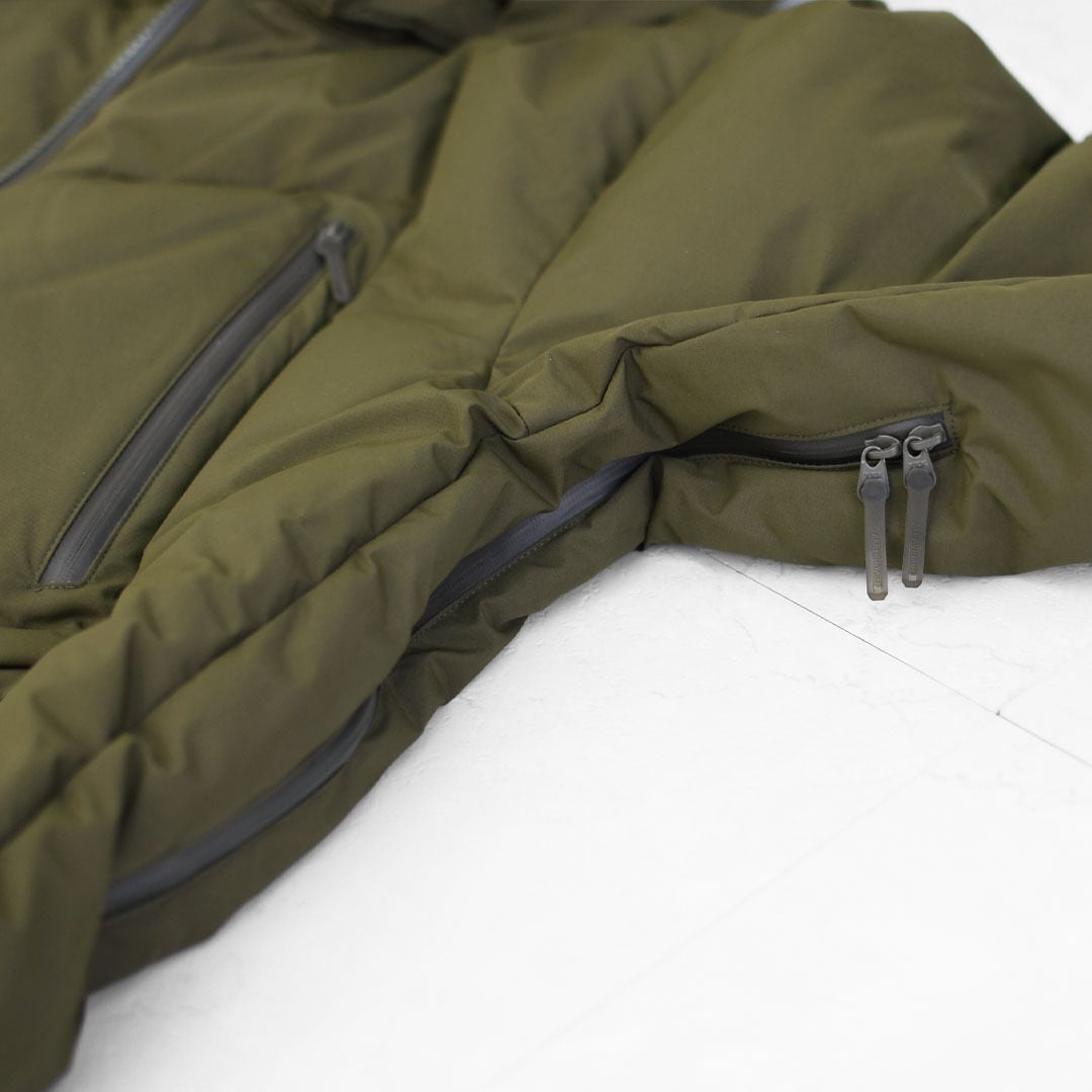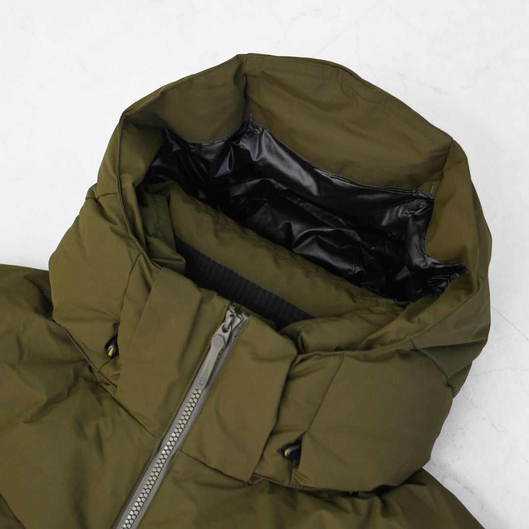 表地、内側に封入されている750フィルパワーのダウンと共に、はっ水加工は自然界で分解されにくいフッ素加工物を一切使用しないC0はっ水機能を採用。ダウン抜けが少なく、防水性を高めた隔壁接着構造ダウンルーム仕様を随所に採用。