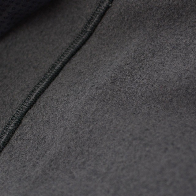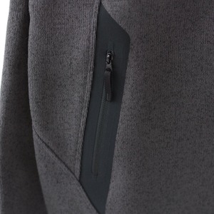 表地はヘザー調でウールのような質感が特徴です。脇下のガセットが動きやすさを実現。