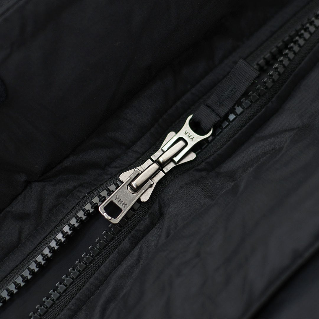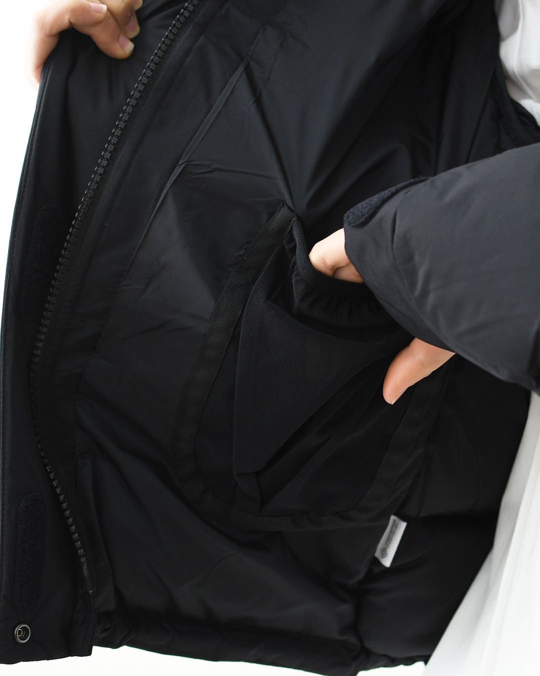 中わた入りの内襟やフロントのダブルフラップなどでコールドスポットを軽減。
