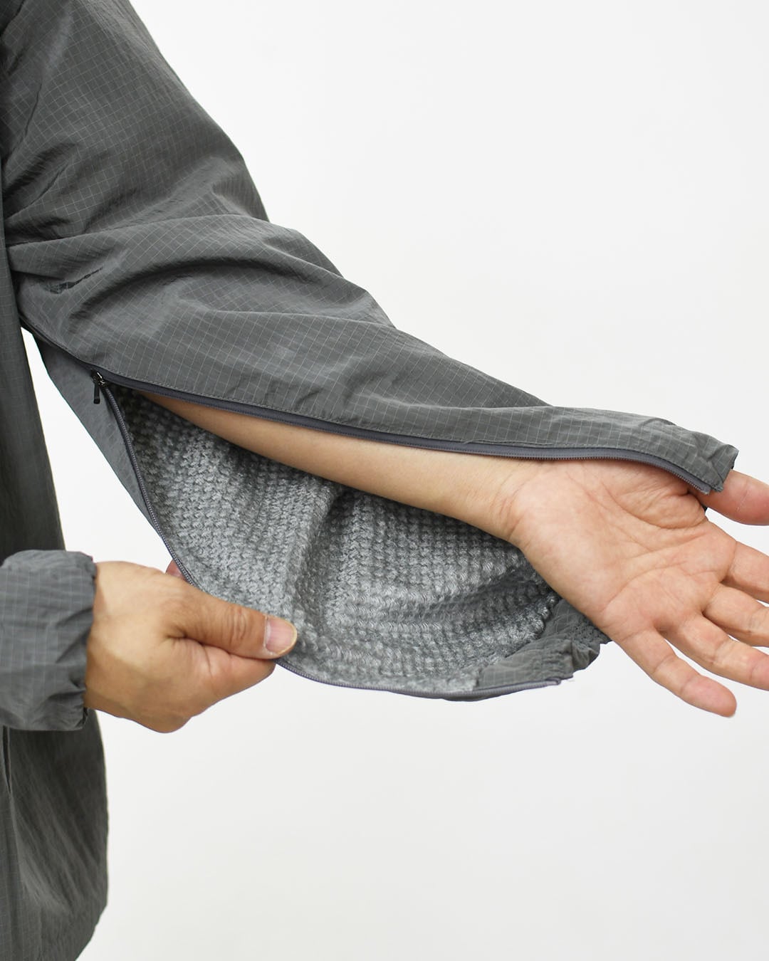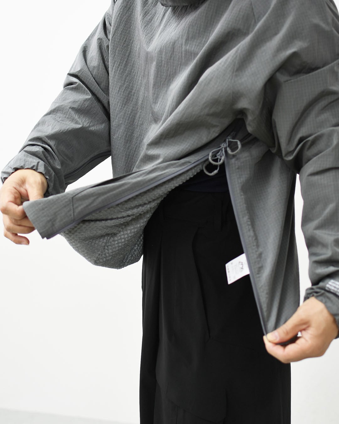 袖口から裾まで一直線に配されたサイドジップが最大のポイント。