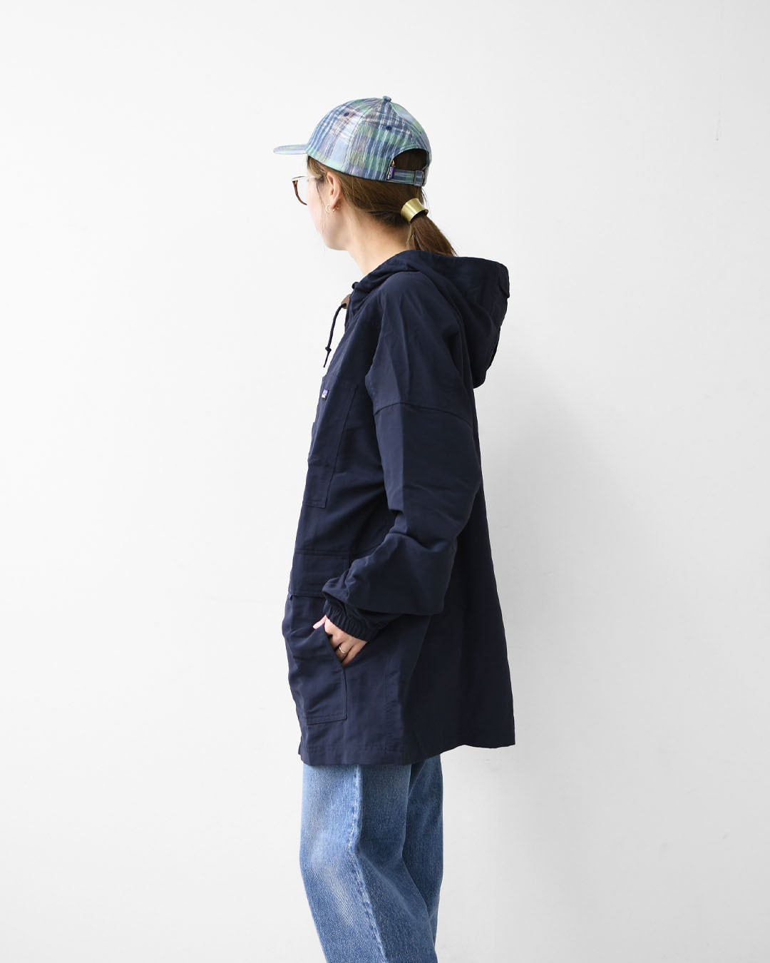 3枚パネル構造の固定式フードは、縁のドローコードを絞れば頭部をしっかりと保護