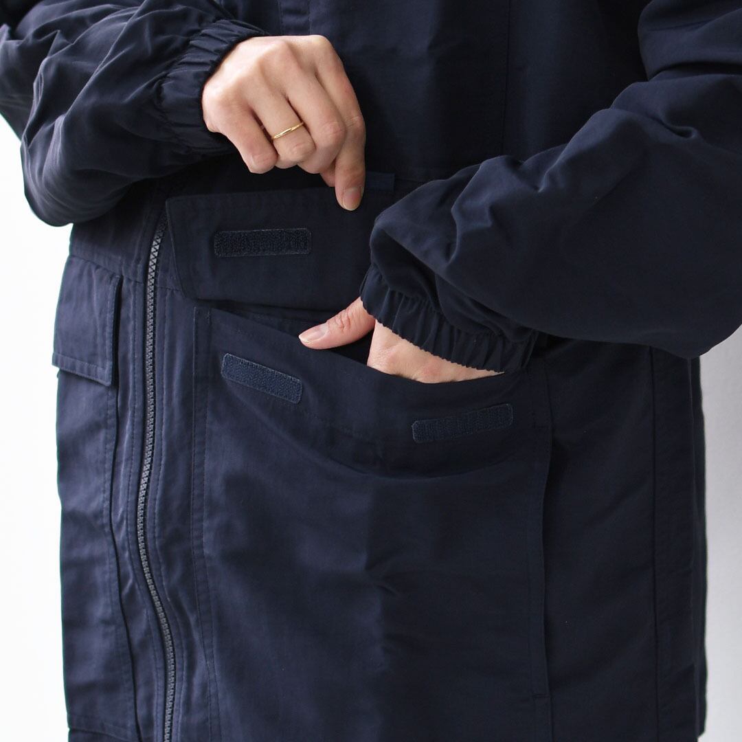 チェストポケットはテープ留めで、2つのハンドウォーマーポケットはフラップ付きの上部からも横からもアクセス可能