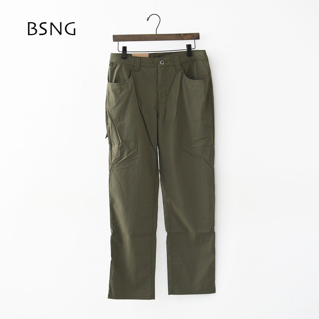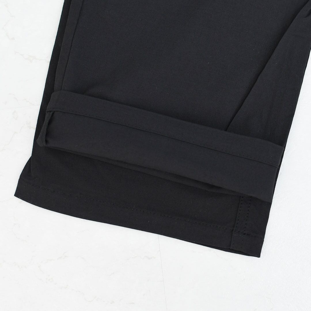 腰までの深さのレギュラーライズ。ヒップと腿はダブつくことも締め付け感もないフィットで、膝から下はストレートなカット。細めから中肉の体形に最適。巻き上げた裾を留めるためのコードとボタンにより用途を拡大
