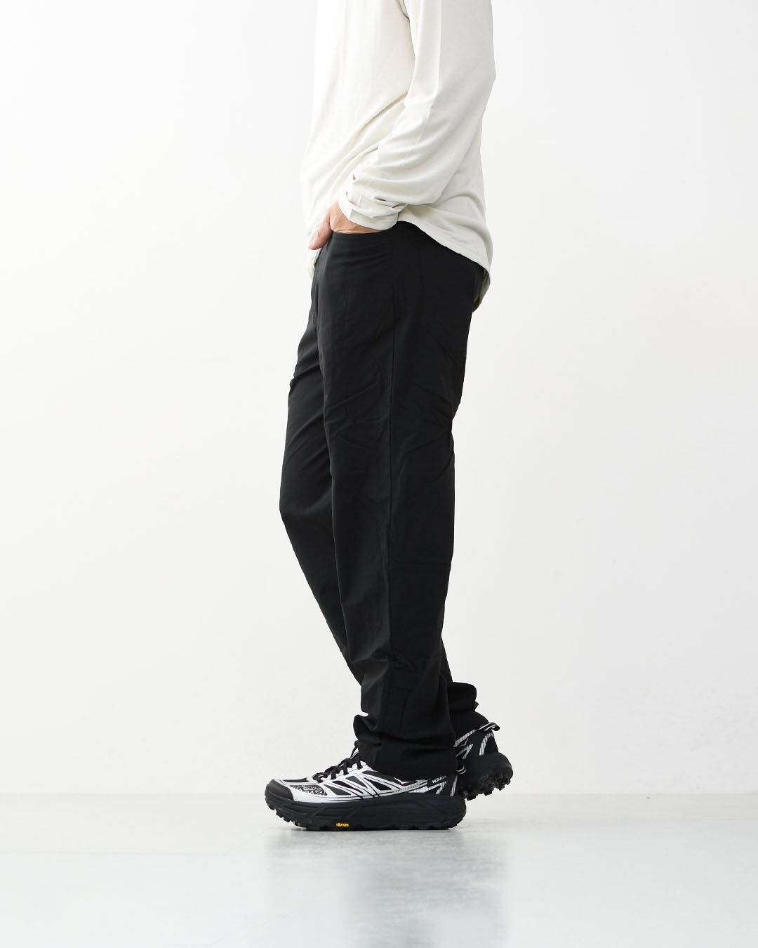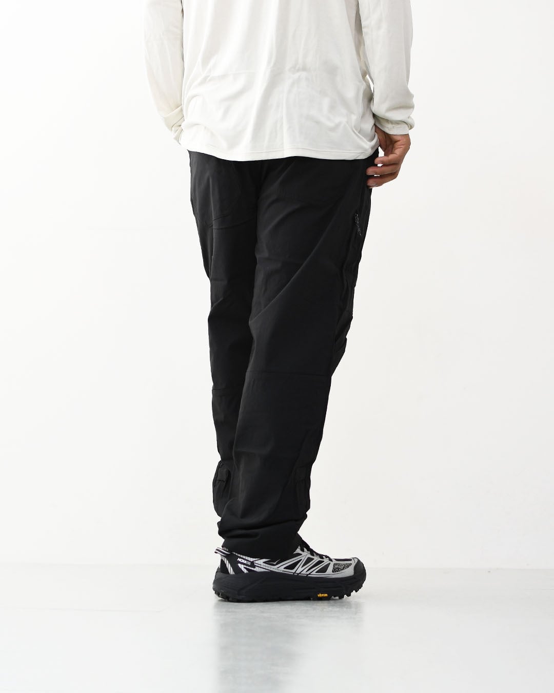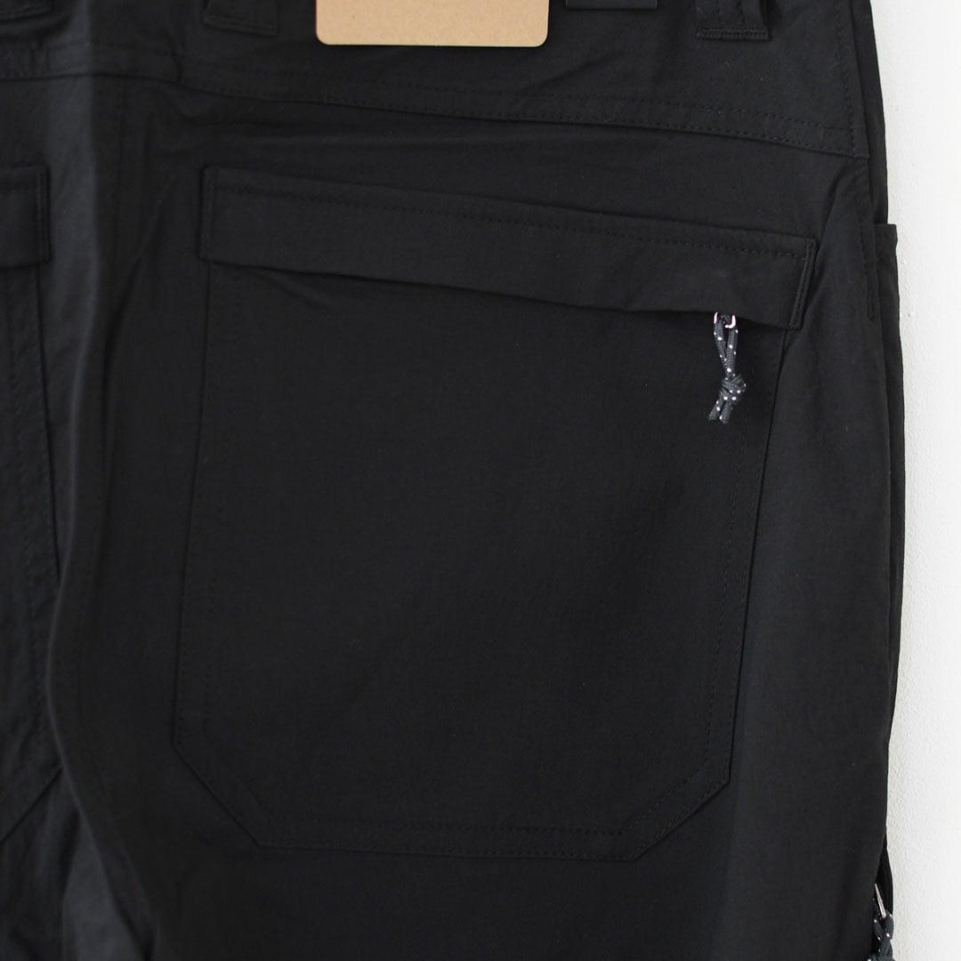 漁網をリサイクルして海洋プラスチック汚染の削減に貢献する、ストレッチ平織りのネットプラス・ポストコンシューマーリサイクル・ナイロン96%/ポリウレタン4%素材を使用。PFASを意図的に添加せずに製造されたDWR(耐久性撥水)加工済み。UPF(紫外線防止指数)40+のUVプロテクションによりトレイルでのさまざまな用途で脚をカバー