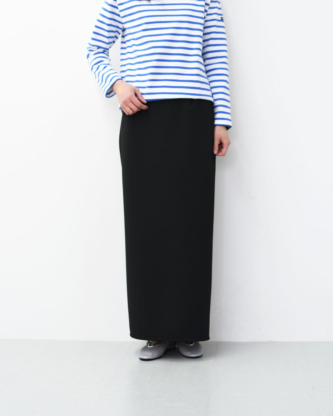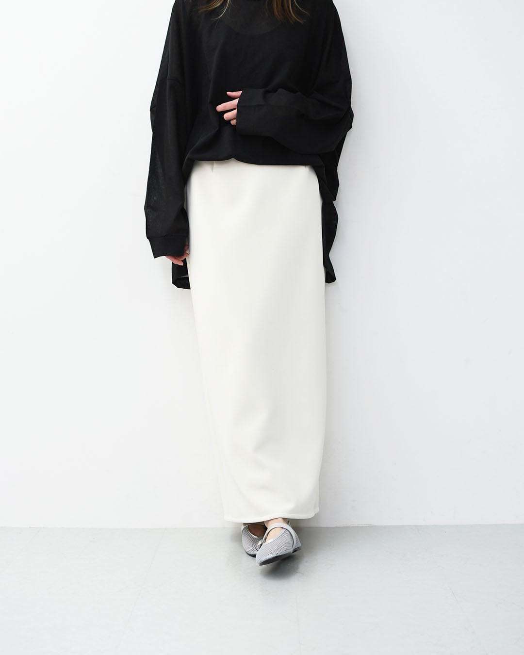 すっきりとした縦のラインが印象的な、MICA & DEALのIラインスカート。