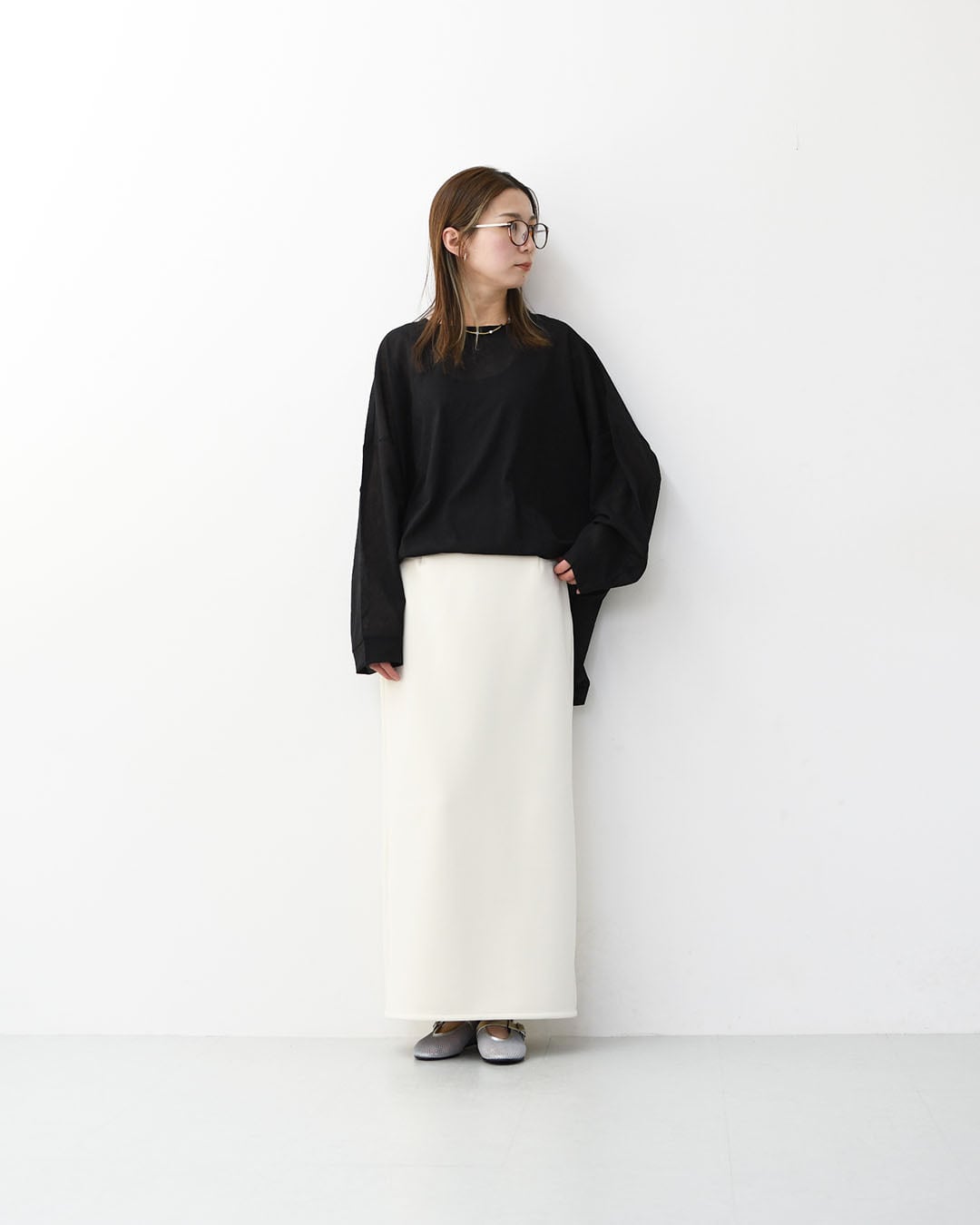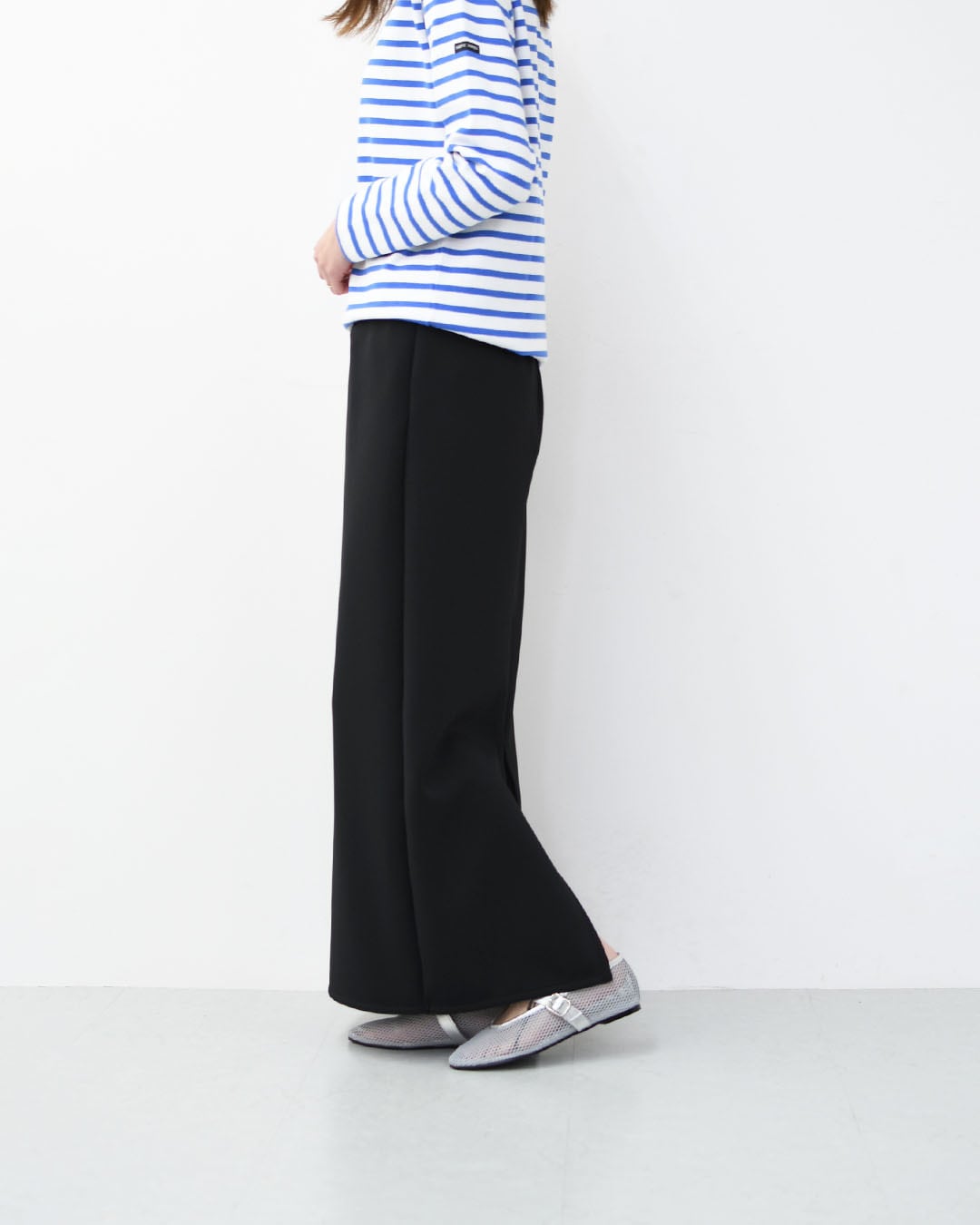 足元をパンプスにすればよりフォーマルに、 フラットシューズやローファーで合わせれば、ほどよく力の抜けた大人のスタイルが完成します。