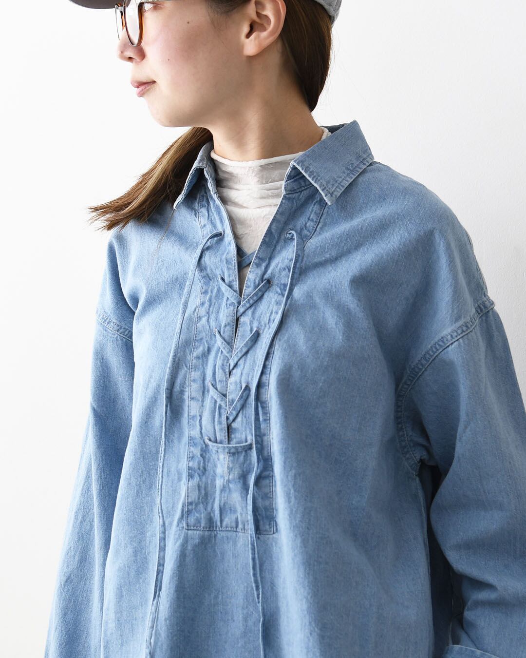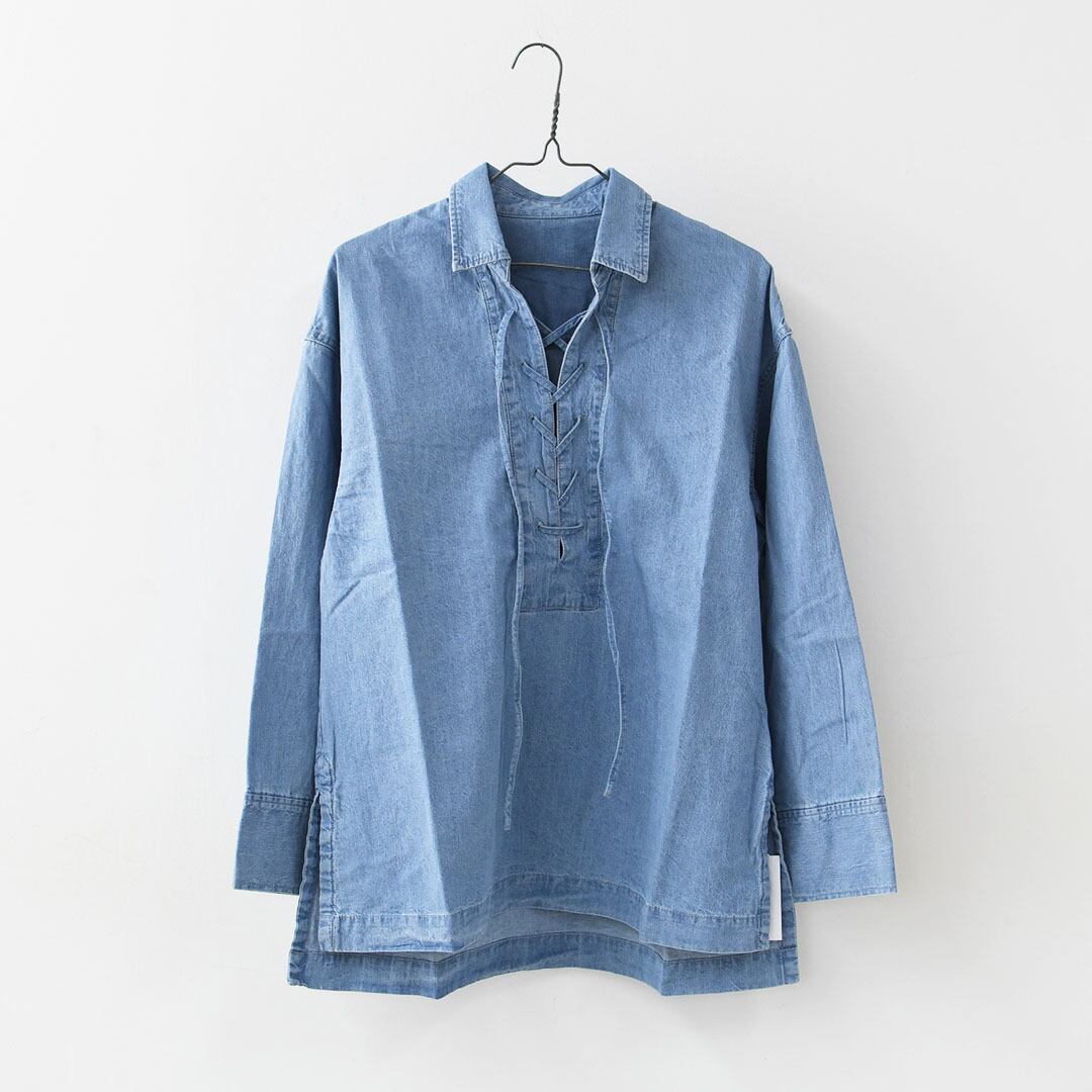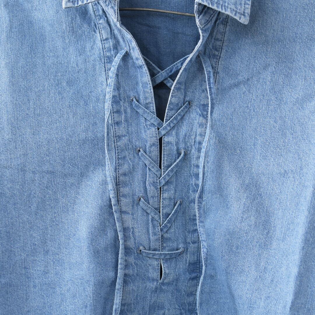 デニムライクなライトブルーが爽やかな印象のレースアップブラウス。