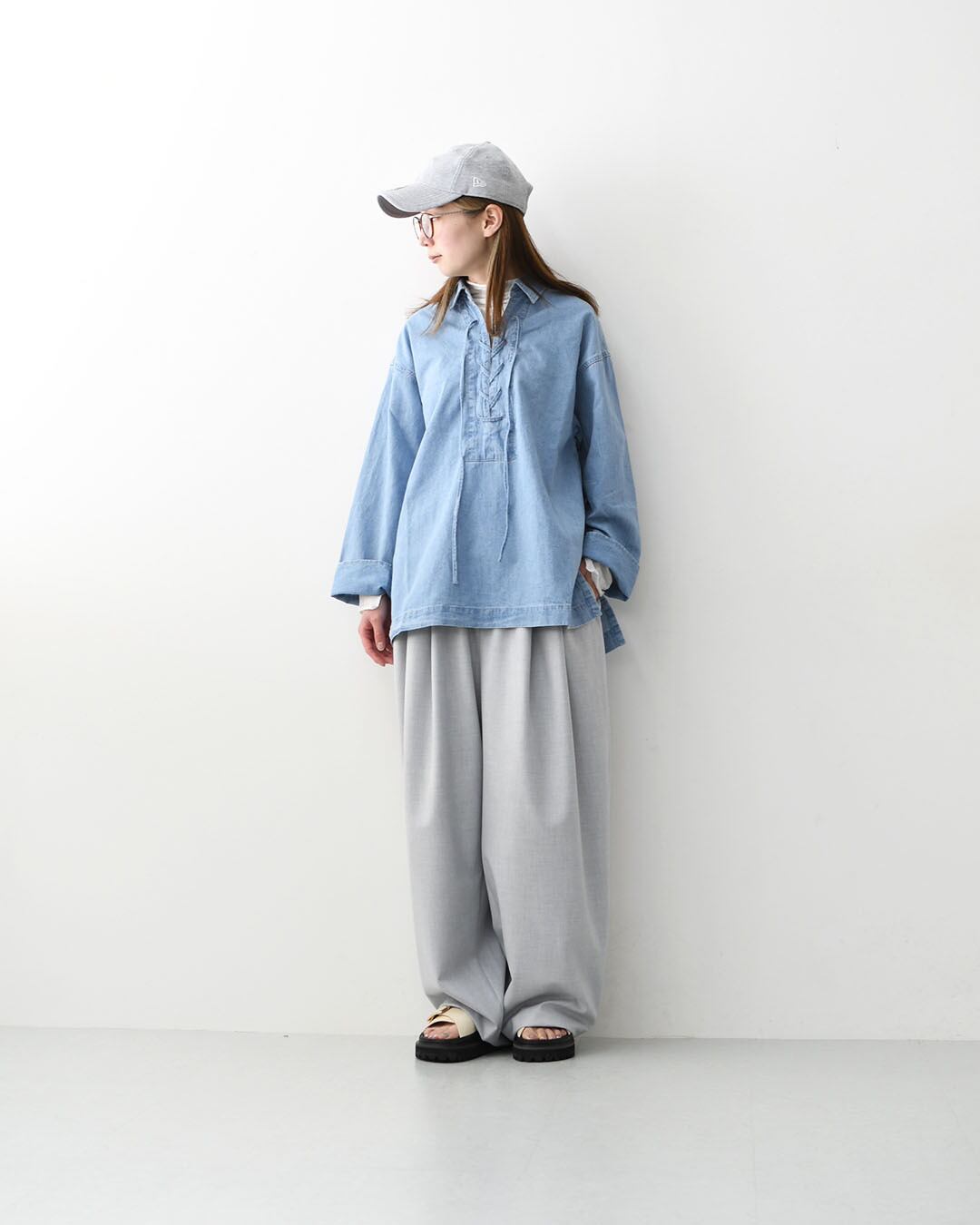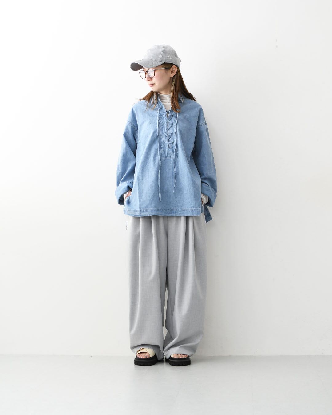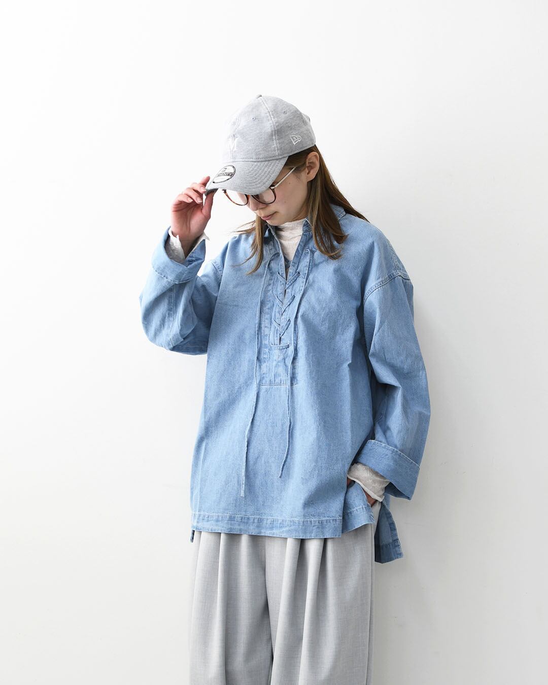 デニムライクなライトブルーが爽やかな印象のレースアップブラウス。