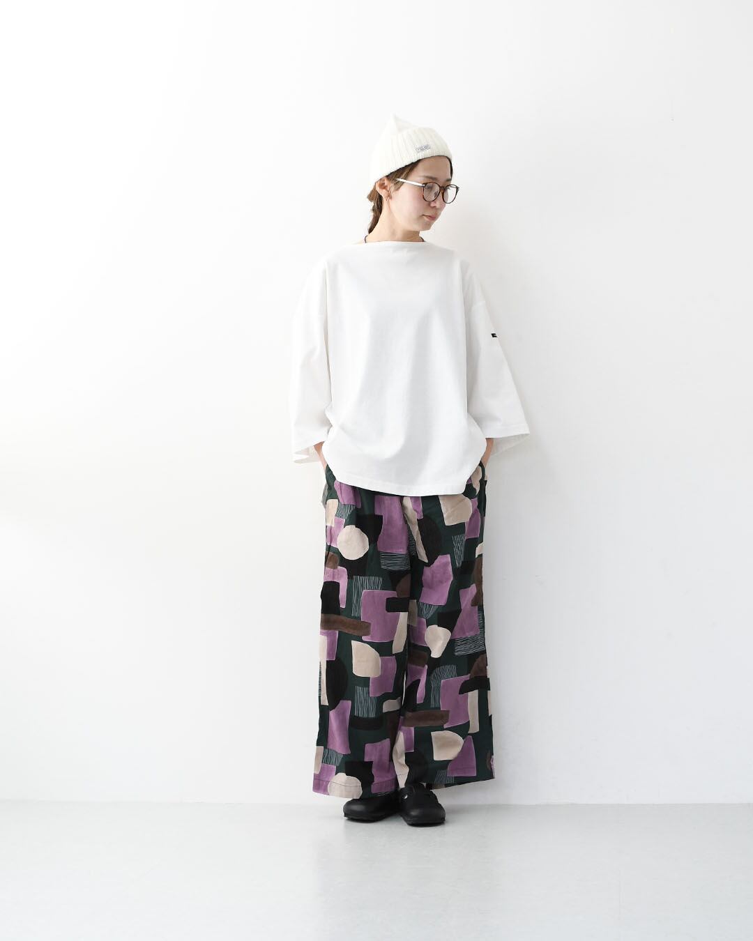 無地のTシャツやシャツと合わせて、柄を主役にしたナチュラルスタイル