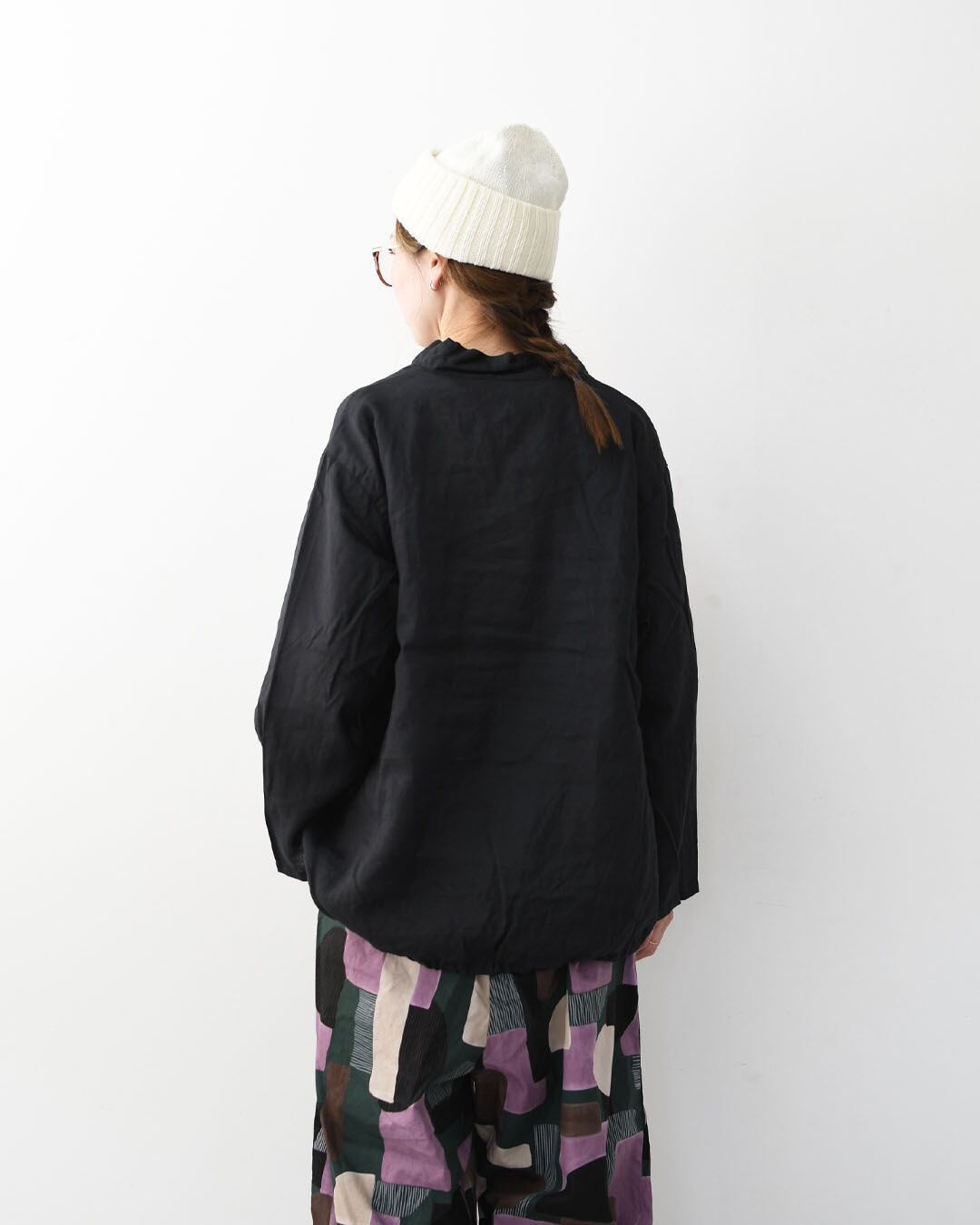 身幅はワイドですが、裾がやさしく絞られているため広がりすぎず、どんなボトムスともバランスよく合わせやすいのも魅力。