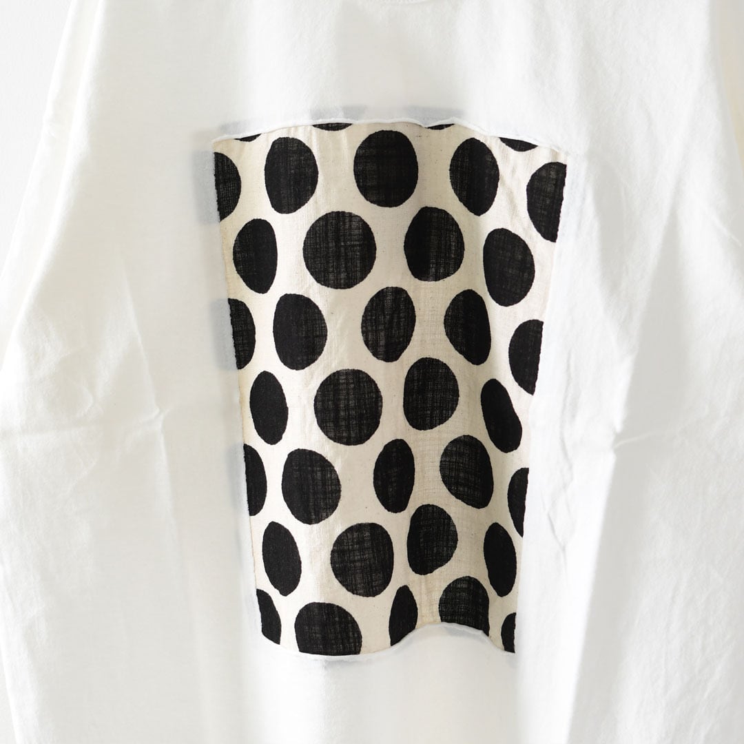 前身頃をフレーム型にカットオフし、その内側にドット柄とチェック柄の生地を組み合わせたデザイン。