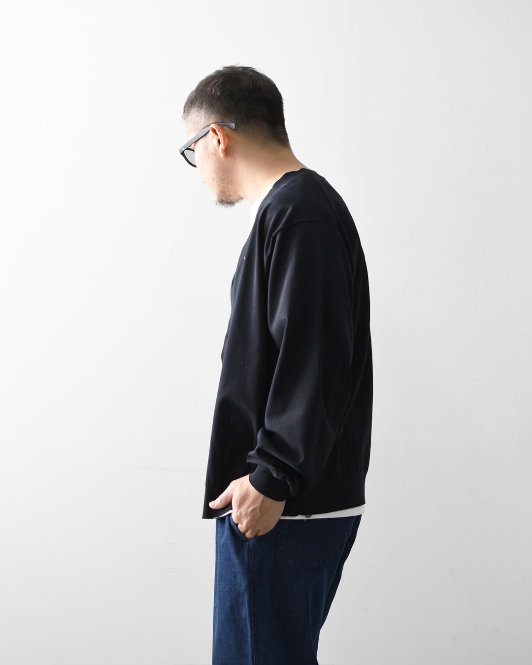 深すぎないVネックは、Tシャツにもシャツにも自然に馴染む絶妙なバランス。