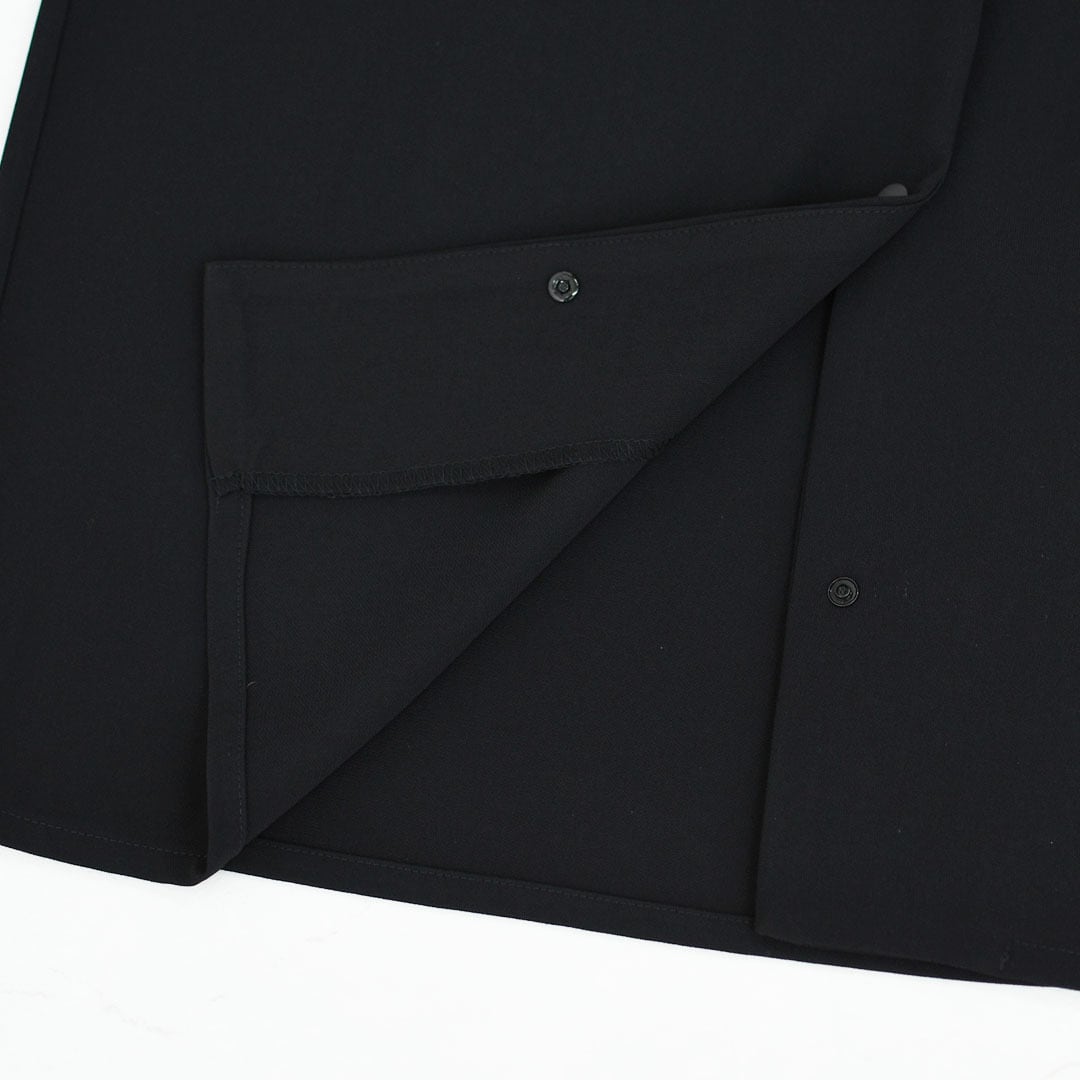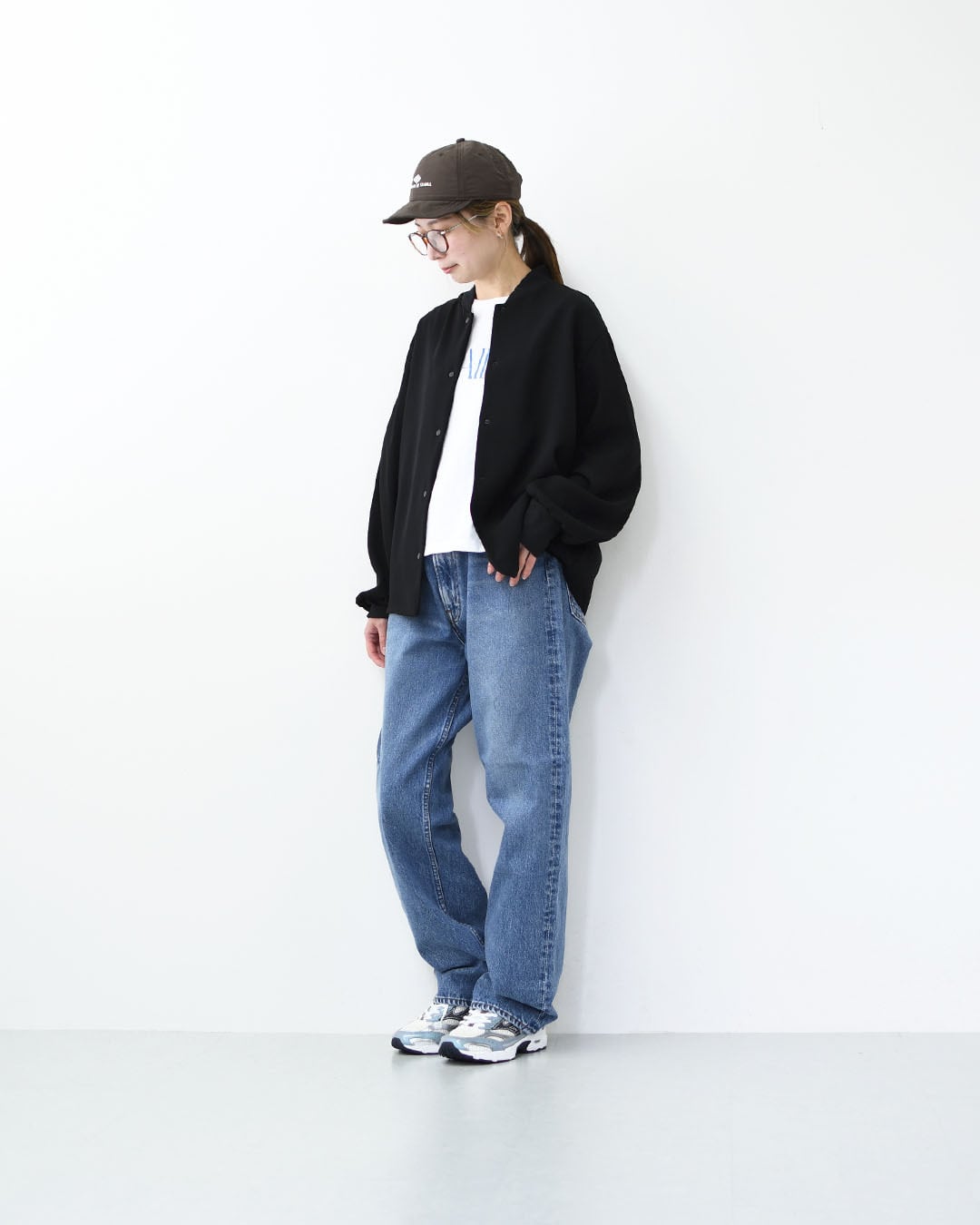 フロントは身頃と同色のスナップボタンで、 ミニマルな印象に仕上げています。 ヒップにかかるほどの丈感と、 ストンと落ちるベーシックなシルエット。 一枚着としてはもちろん、羽織りとしても活躍し、 レイヤードスタイルにも自然に馴染みます。