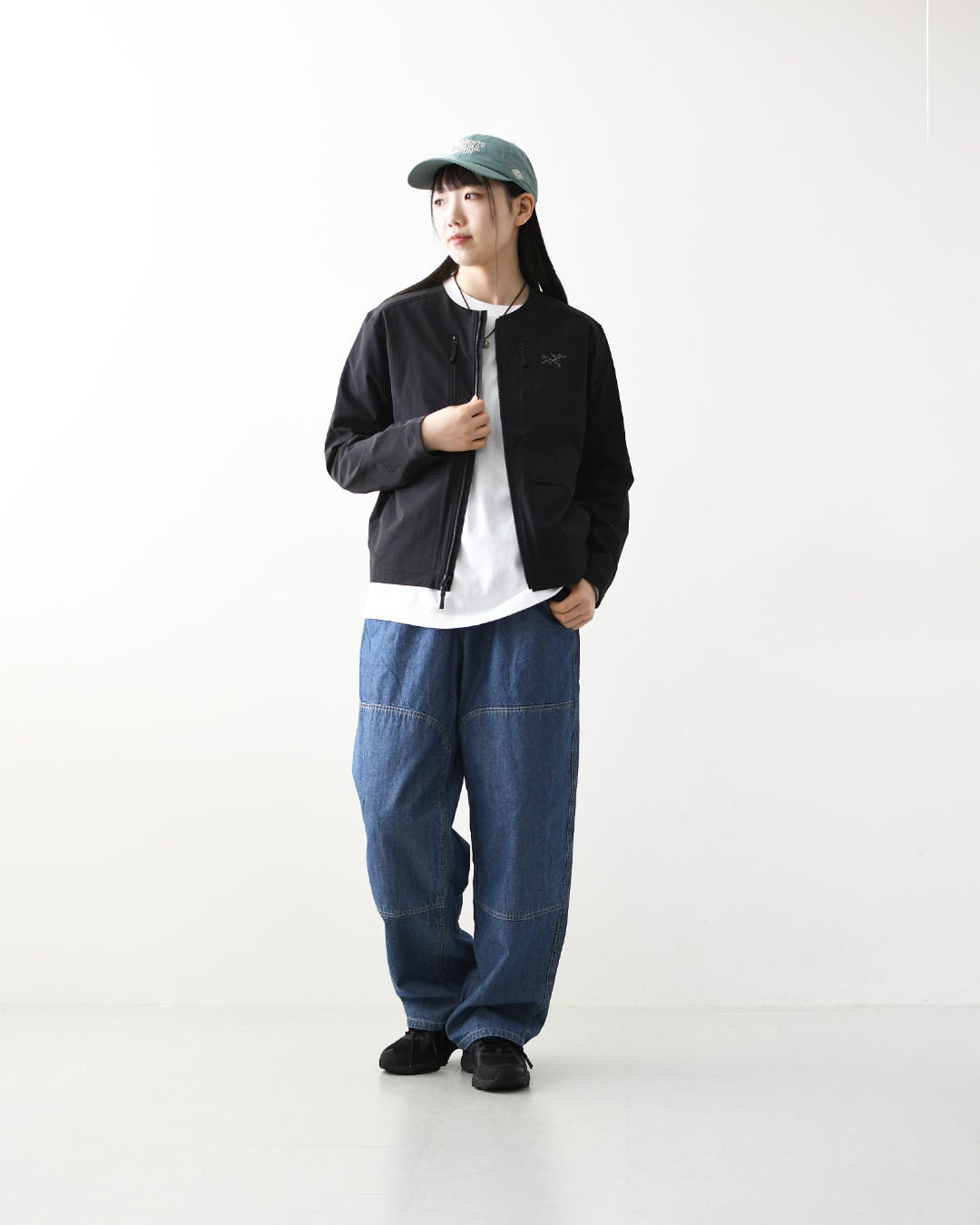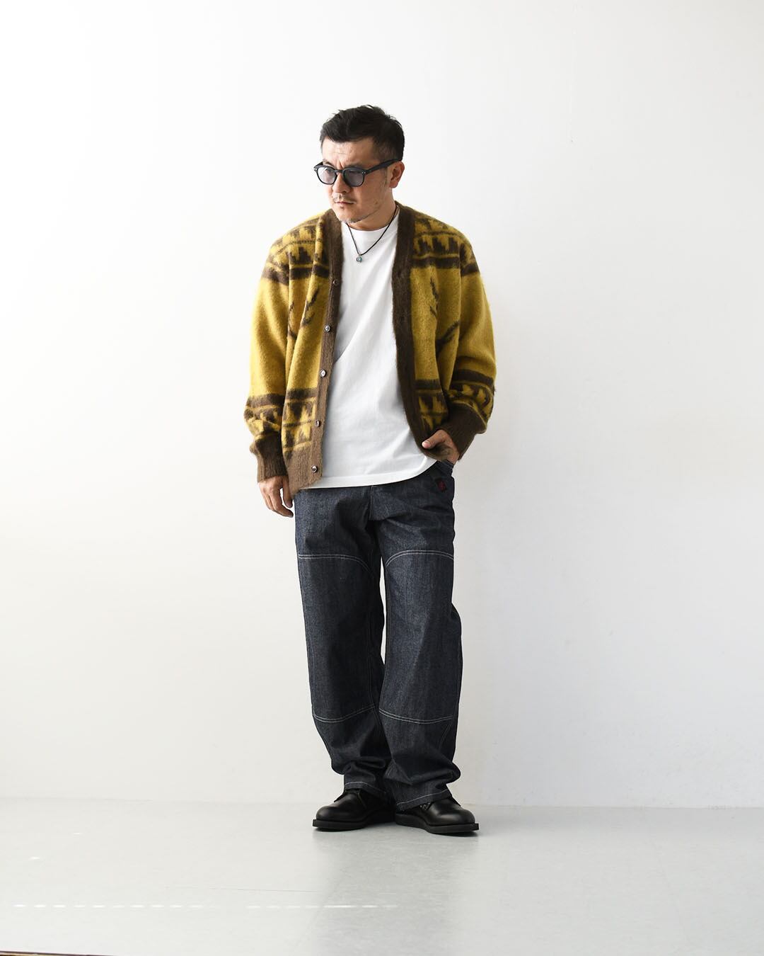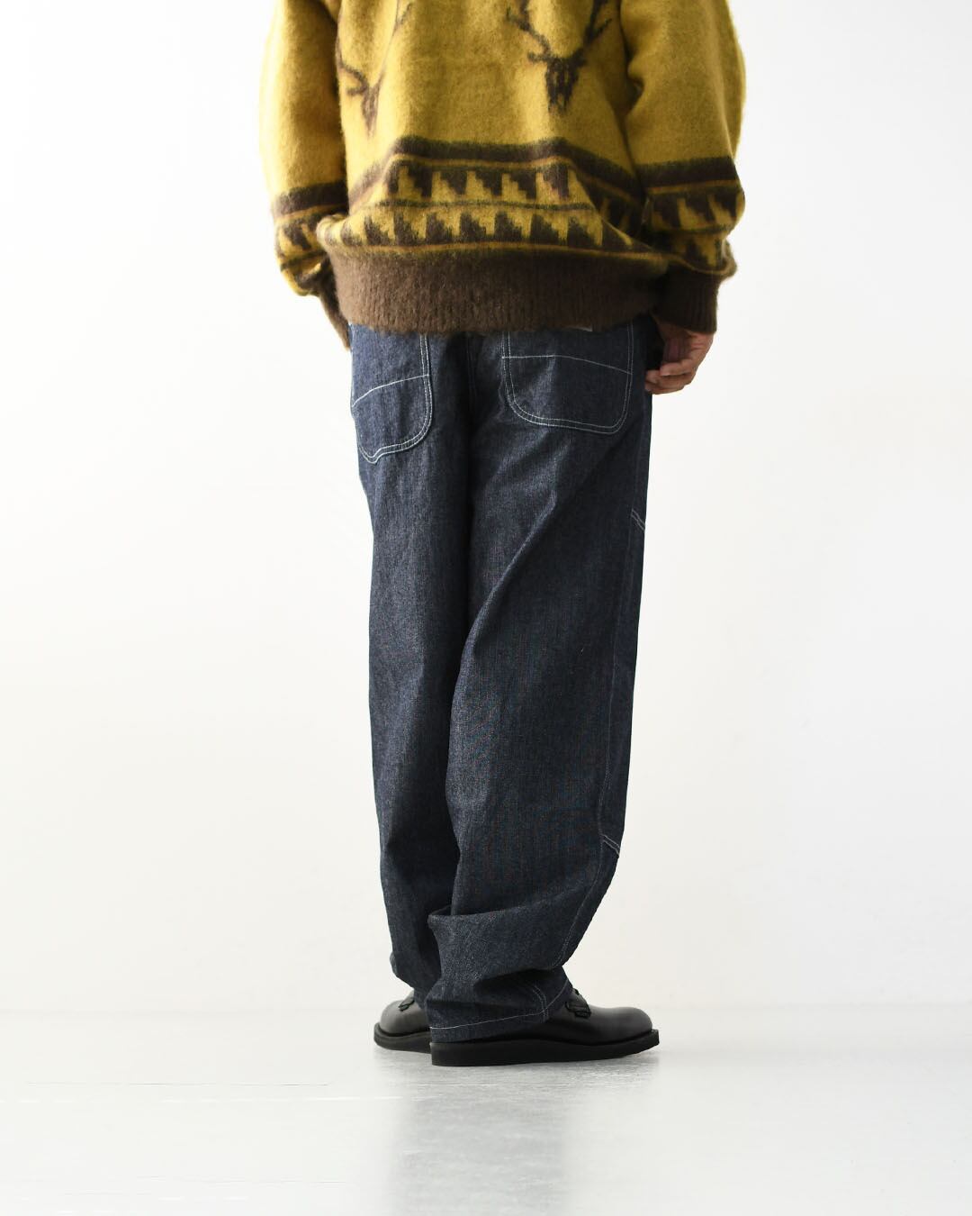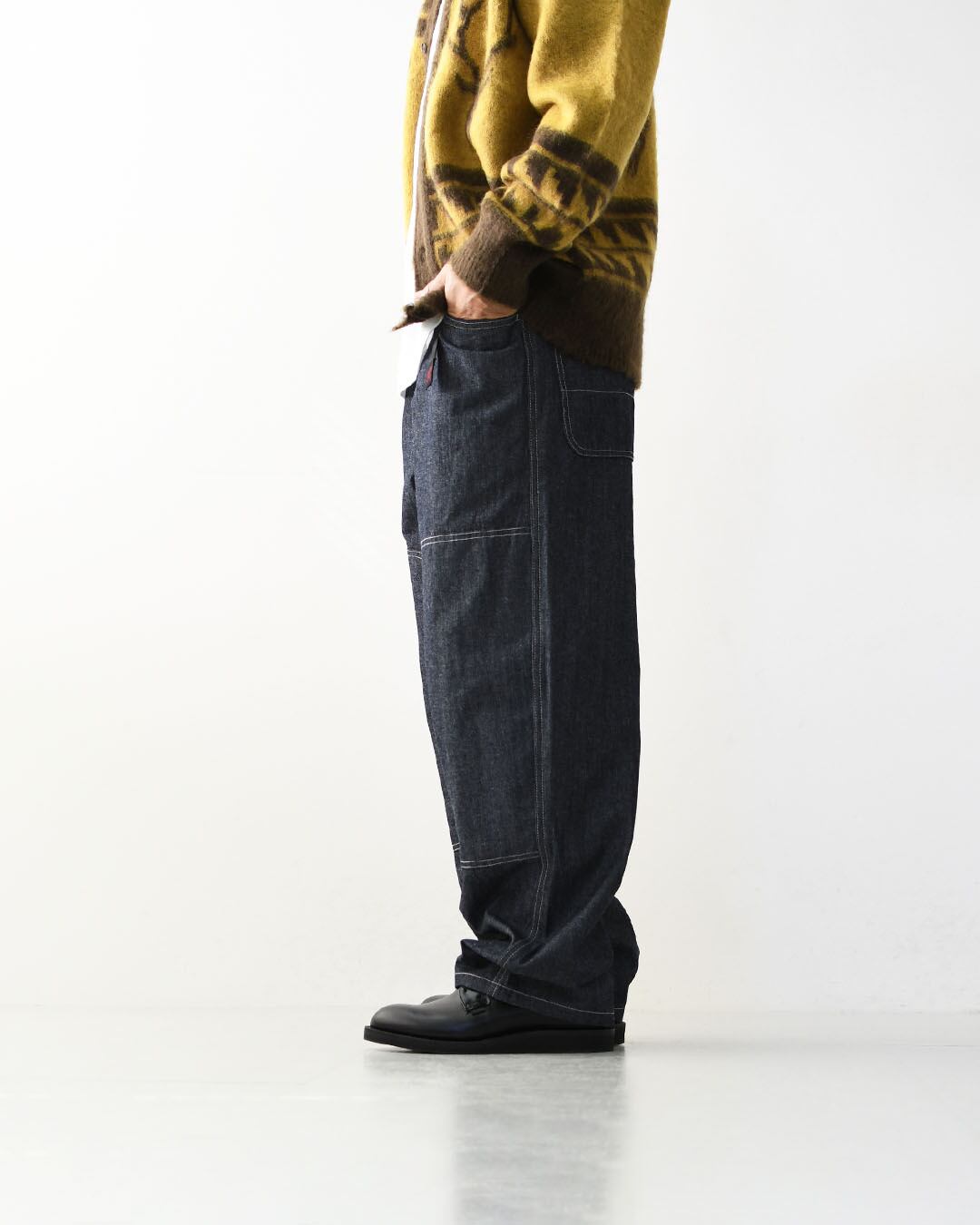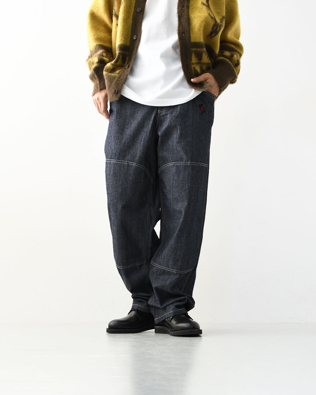 バギーシルエットとホワイトステッチがほどよい抜け感を演出。
