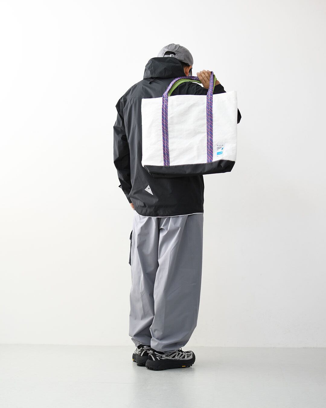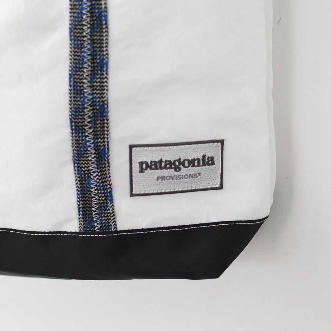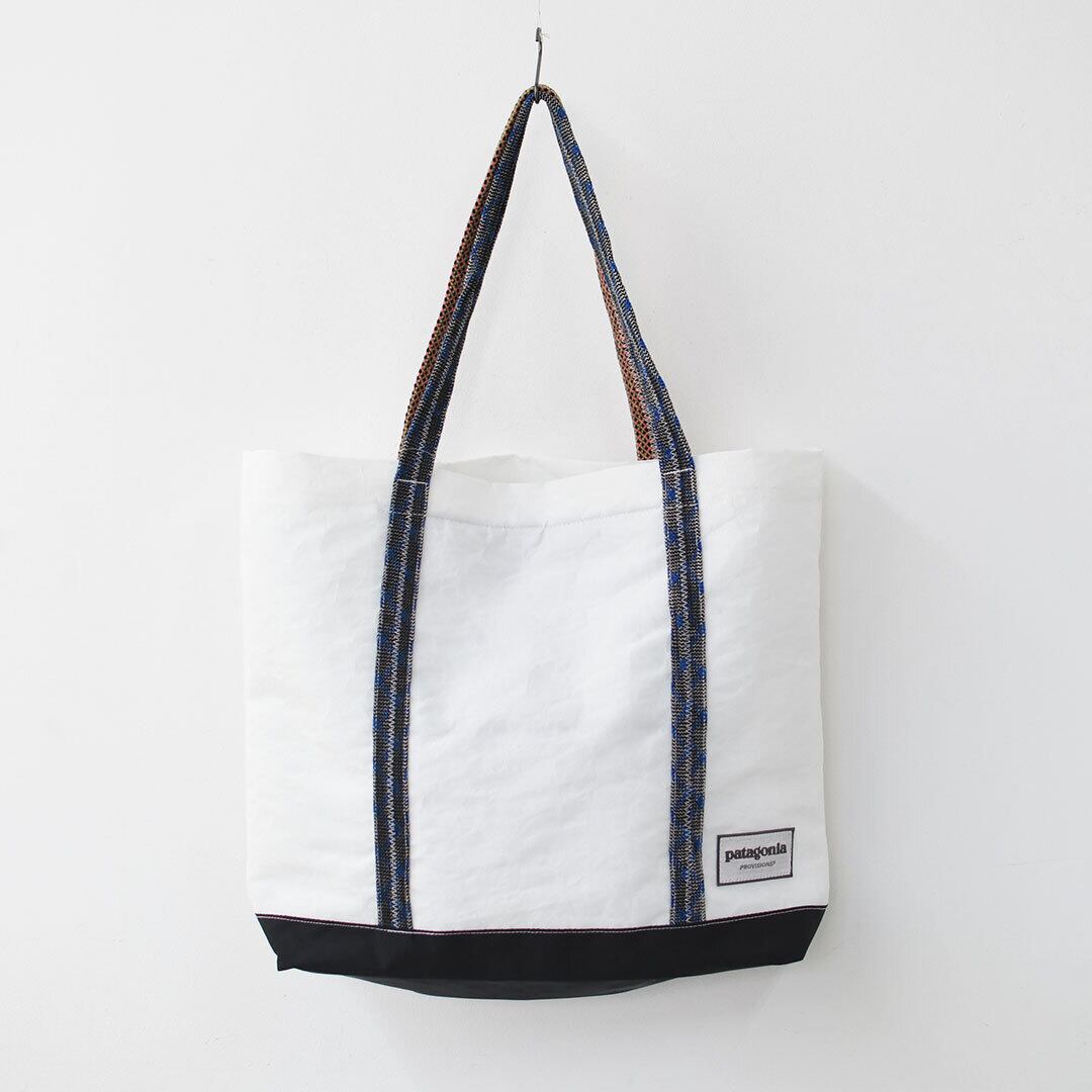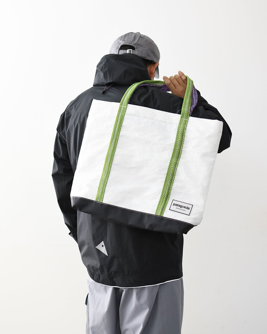 ボディ:ポリエステル100%(帆を再利用)/ポケット:ナイロン100%(着古したパタゴニア・ジャケット)/ハンドル:ナイロン100%(クライミングロープを再利用)/底:リサイクル・ポリエステル(着古したパタゴニア・ウェーダー)