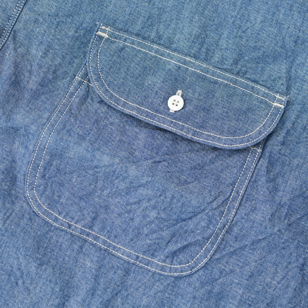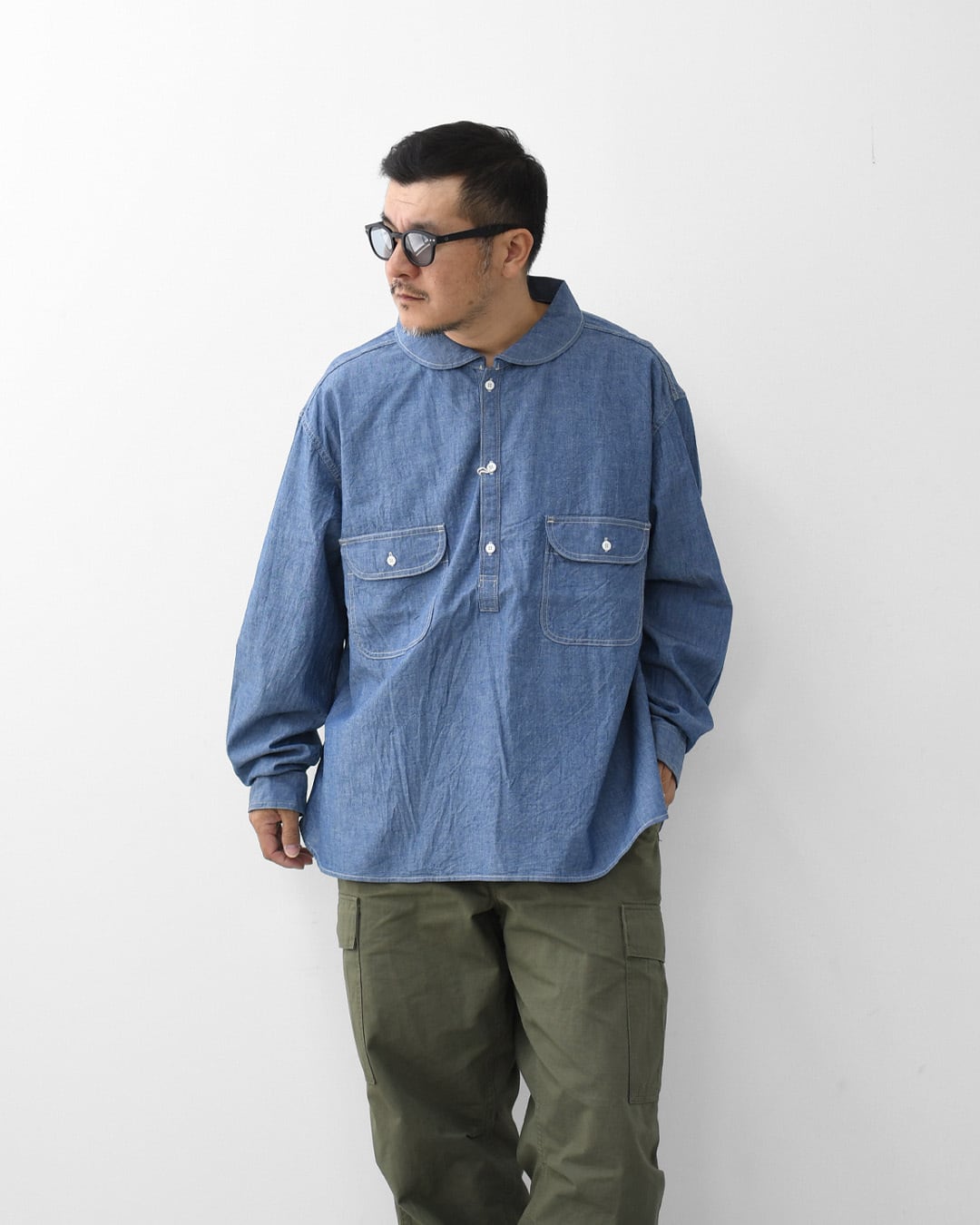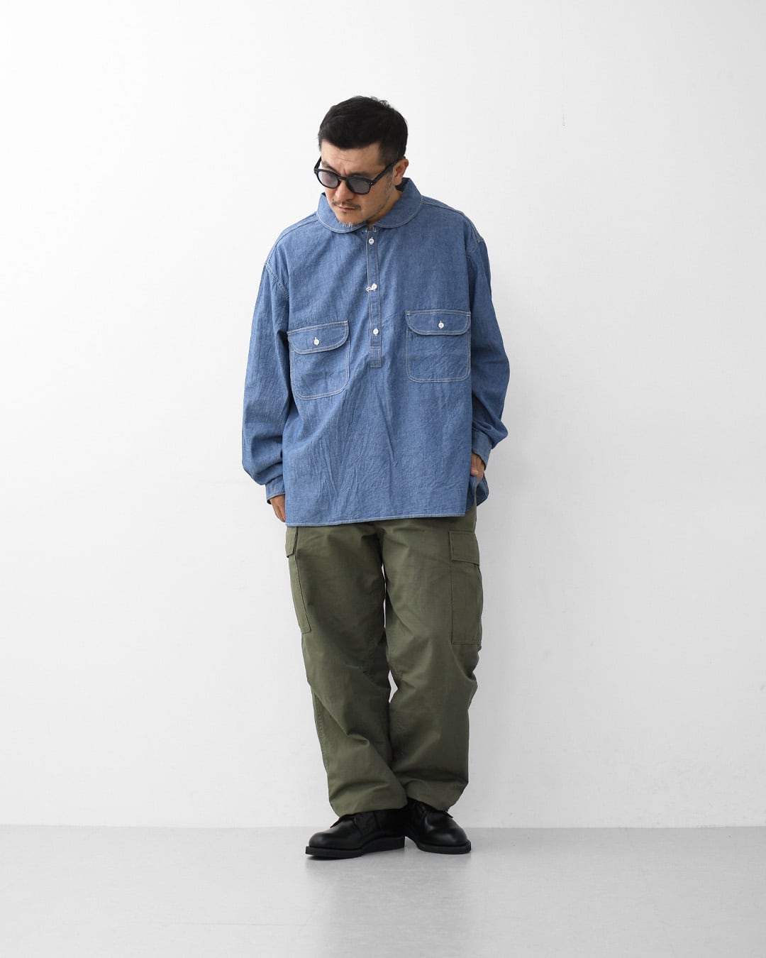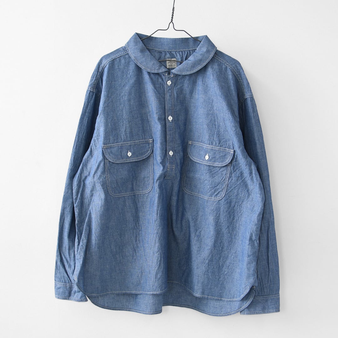 ordinary fitsの定番ワークシャツをベースにしたシャンブレープルオーバーシャツ。