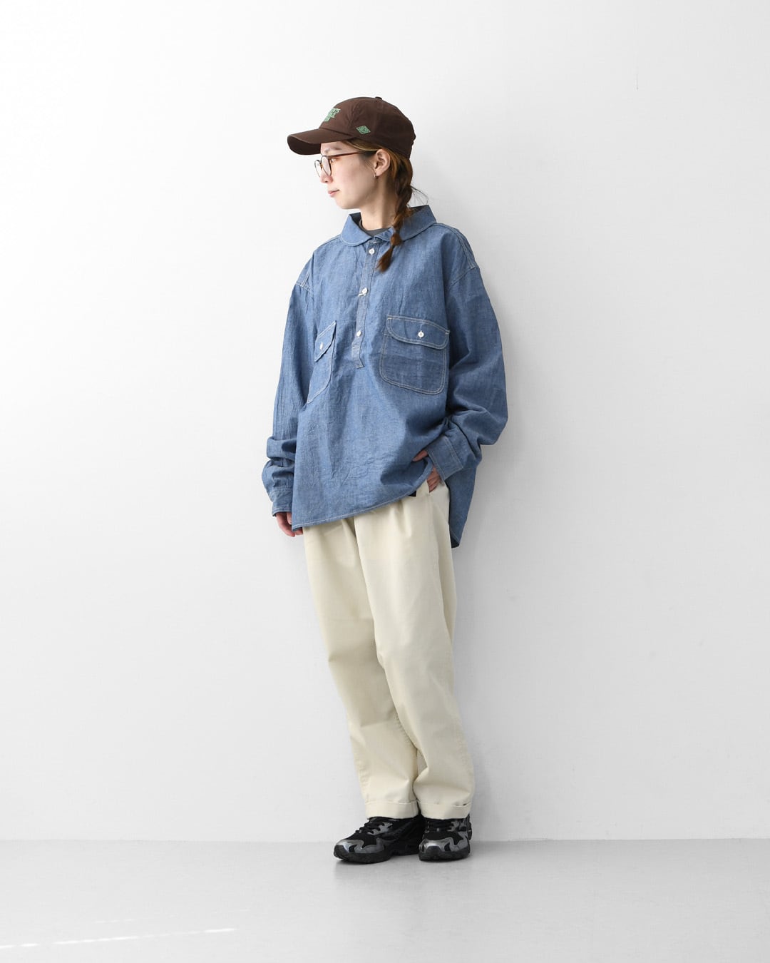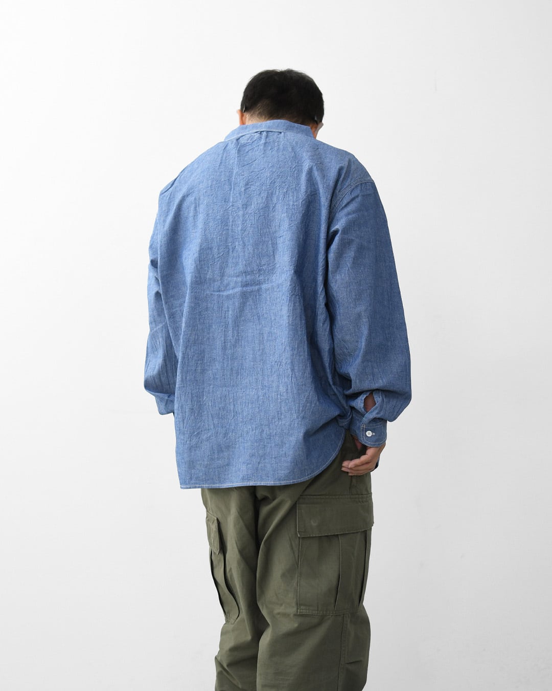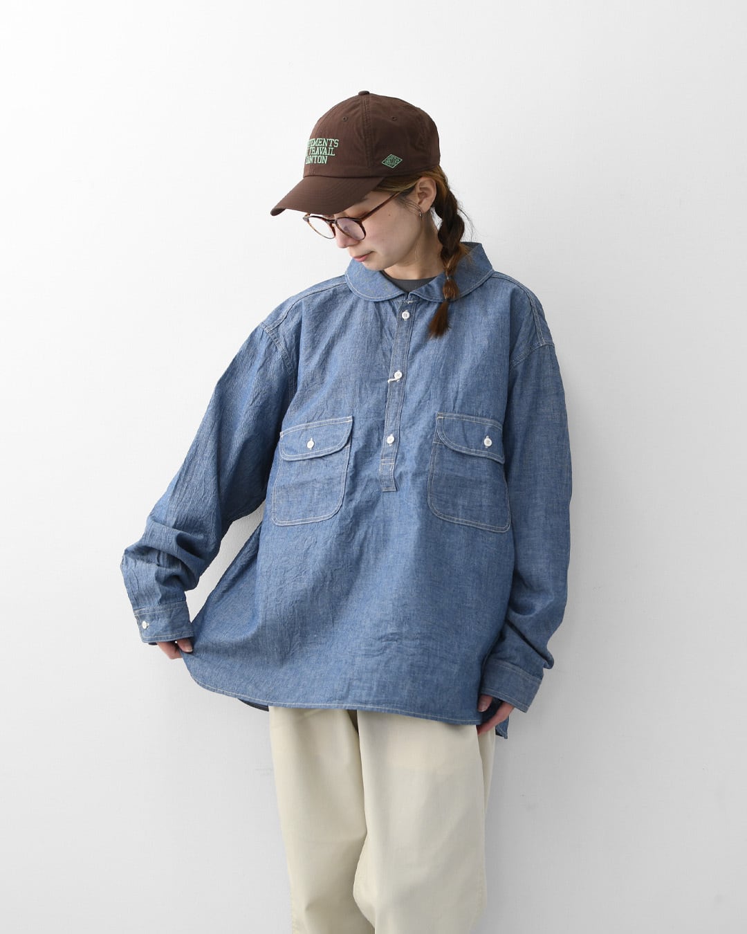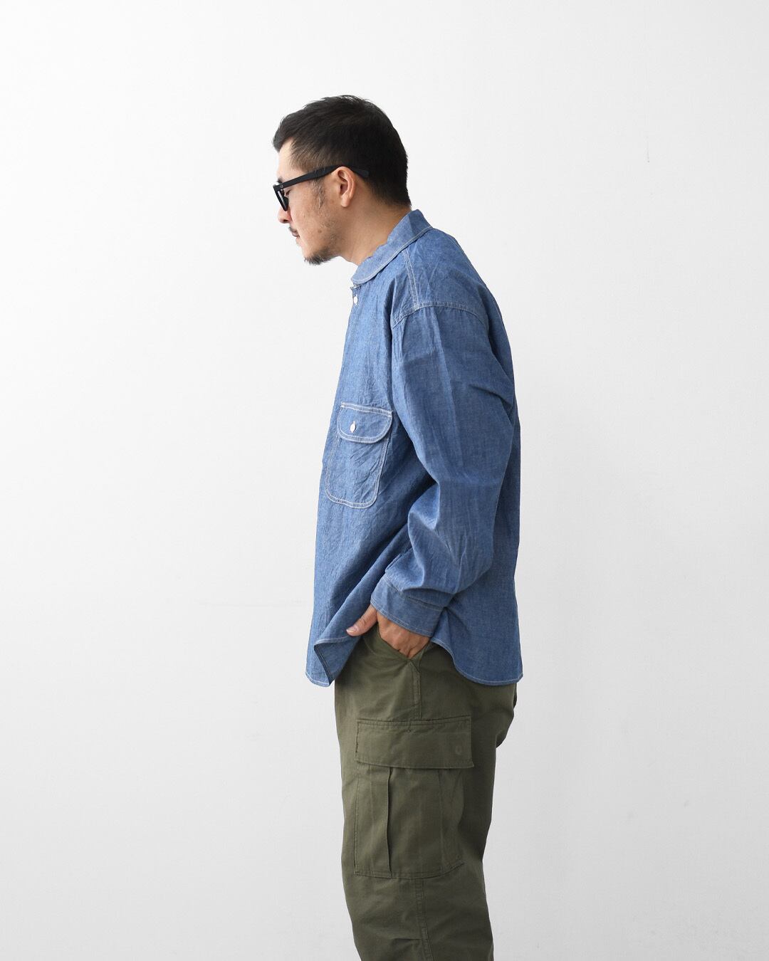 ordinary fitsの定番ワークシャツをベースにしたシャンブレープルオーバーシャツ。