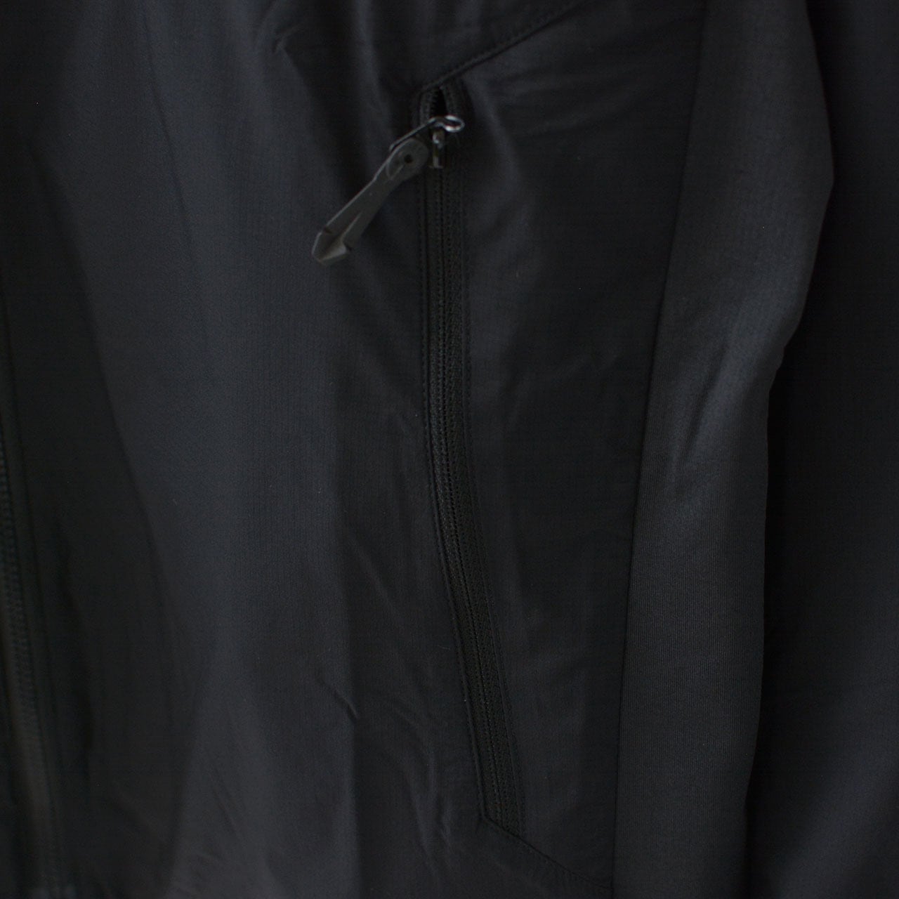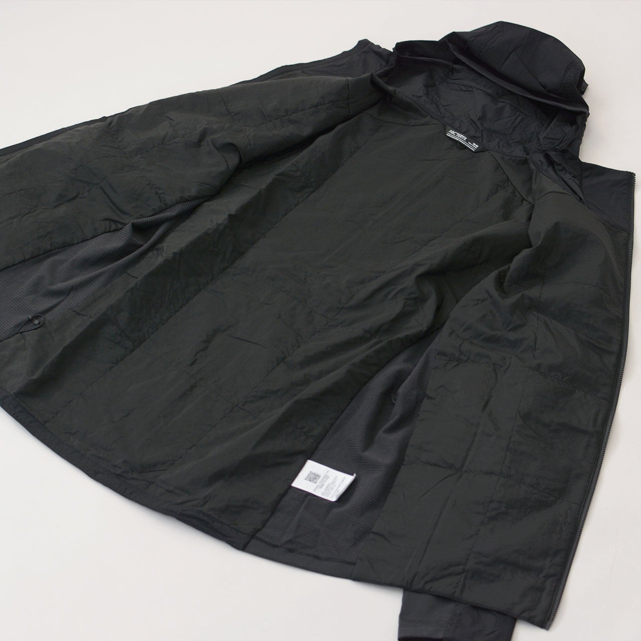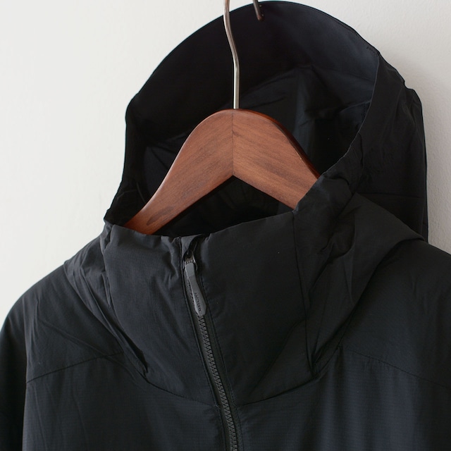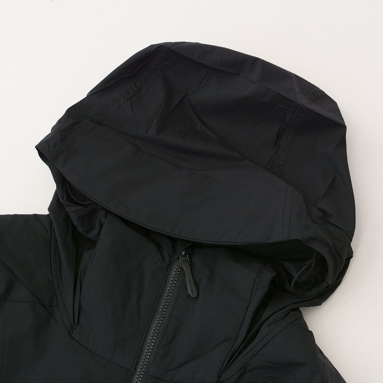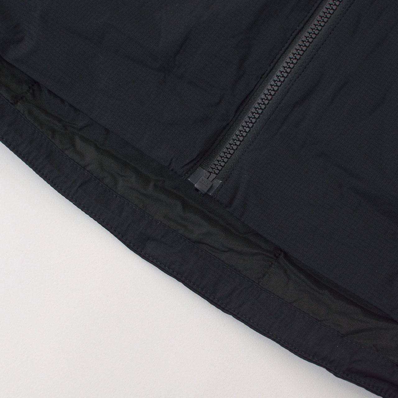 通気性と撥水性を備え、ストレッチインサレーションを袖とフードには使用せずボディにのみ使用することで、収納性を高めるとともに、体幹部を集中的に温めます。