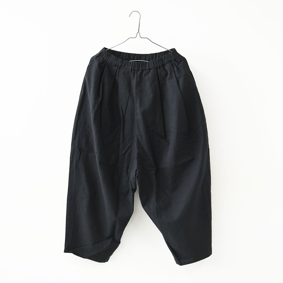 腰まわりはゆとりのあるワイドシルエットながら、裾に向かってやや細くなるテーパードデザインで