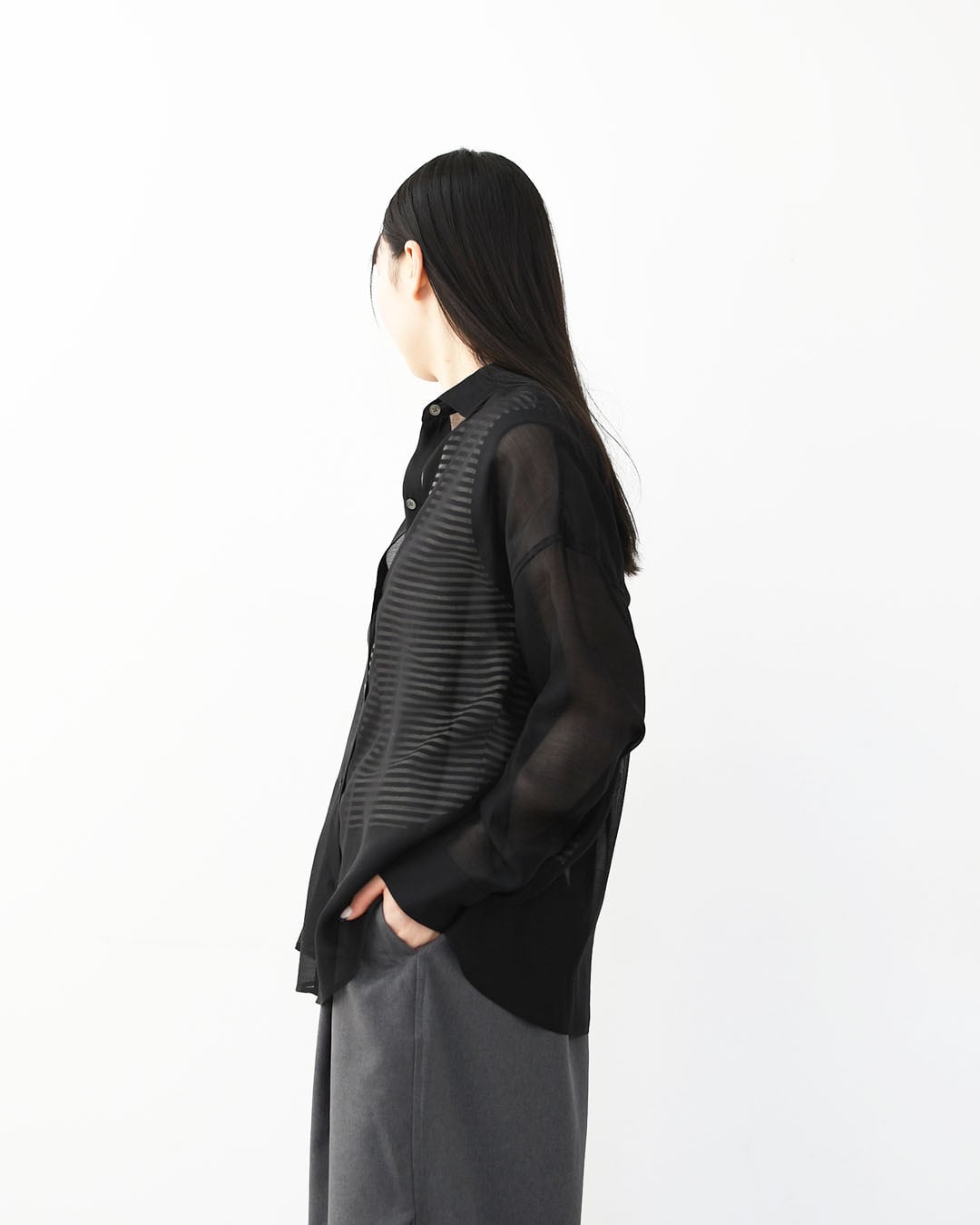 テンセルとポリエステルを使用した、柔らかなオーガンジー素材のシアーシャツ。