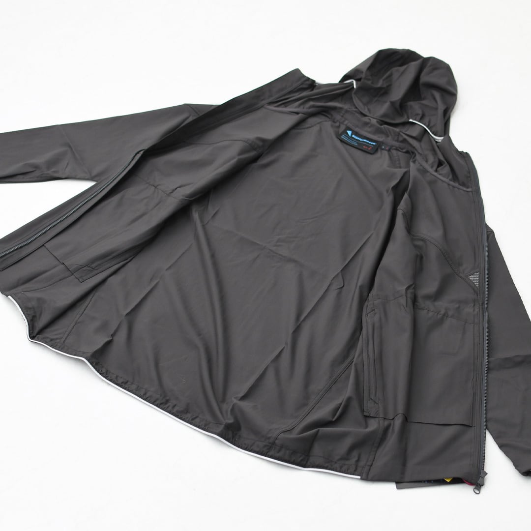 フード、袖口、裾のエッジテープは風を防ぎ、視認性を高める反射素材を採用しています。
