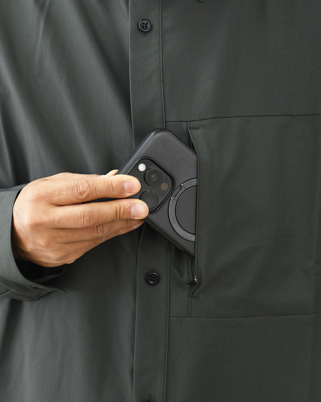 この長袖シャツは、テーラリングとテクノロジーを融合させたミニマルなデザイン、そして汎用性を重視して作られました。