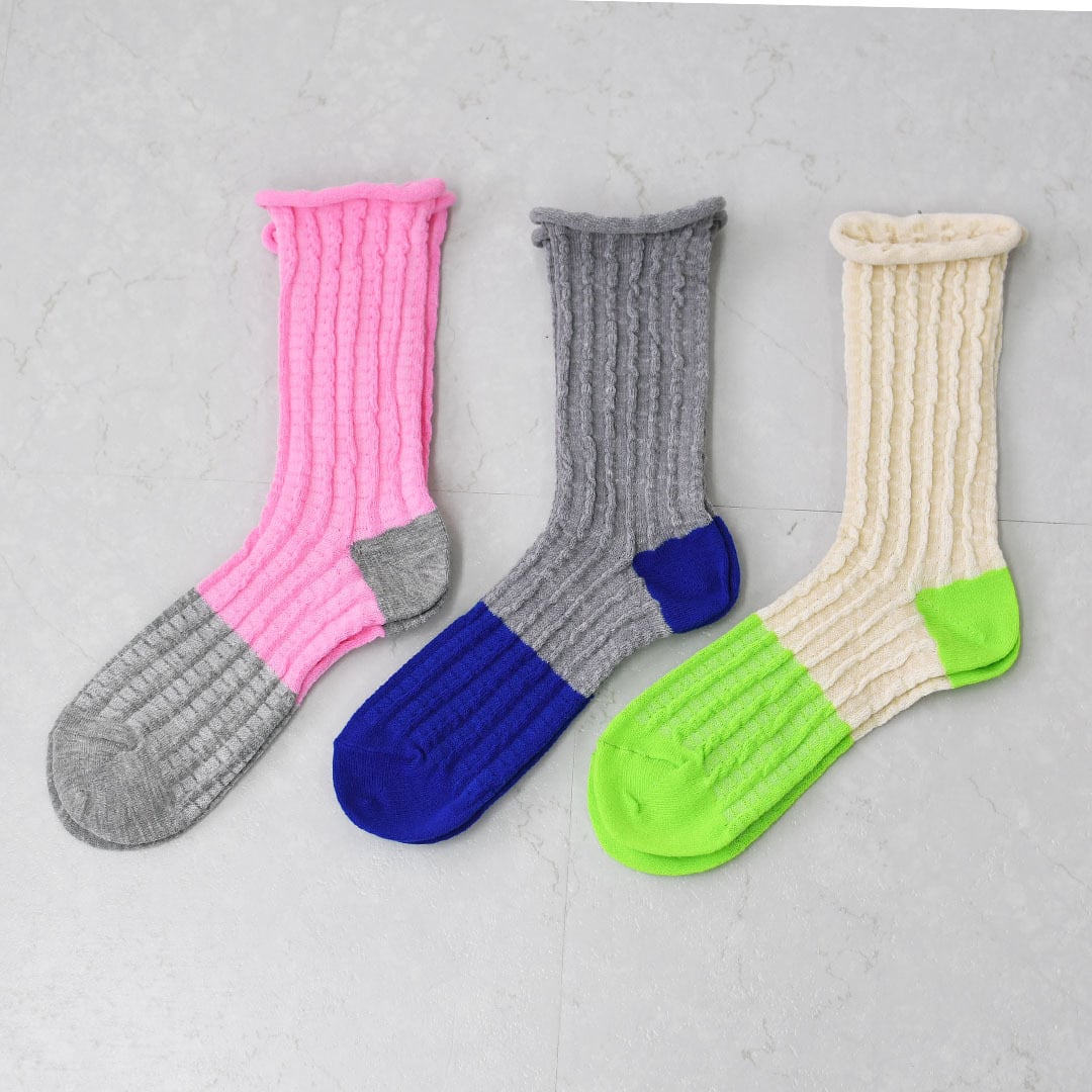 足元にさりげないアクセントをプラスしてくれる、バイカラーデザインのソックス。