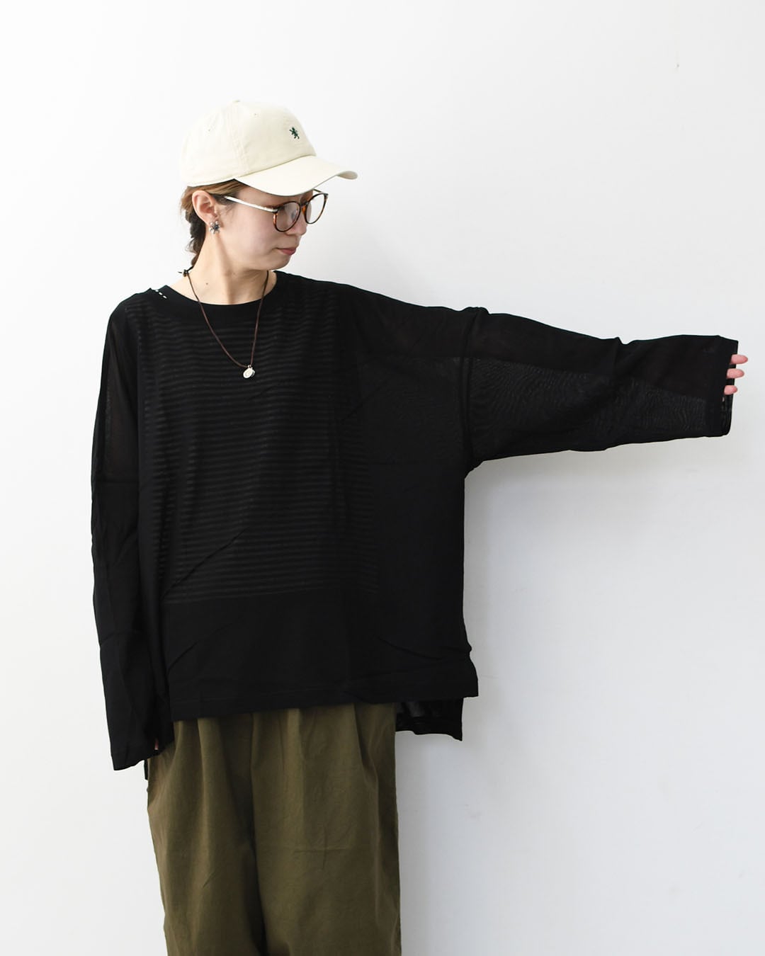 軽やかな透け感が魅力のメッシュロングスリーブT。