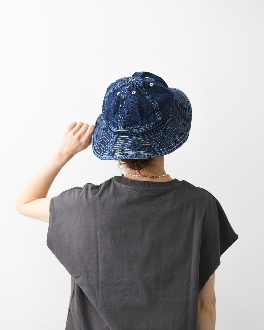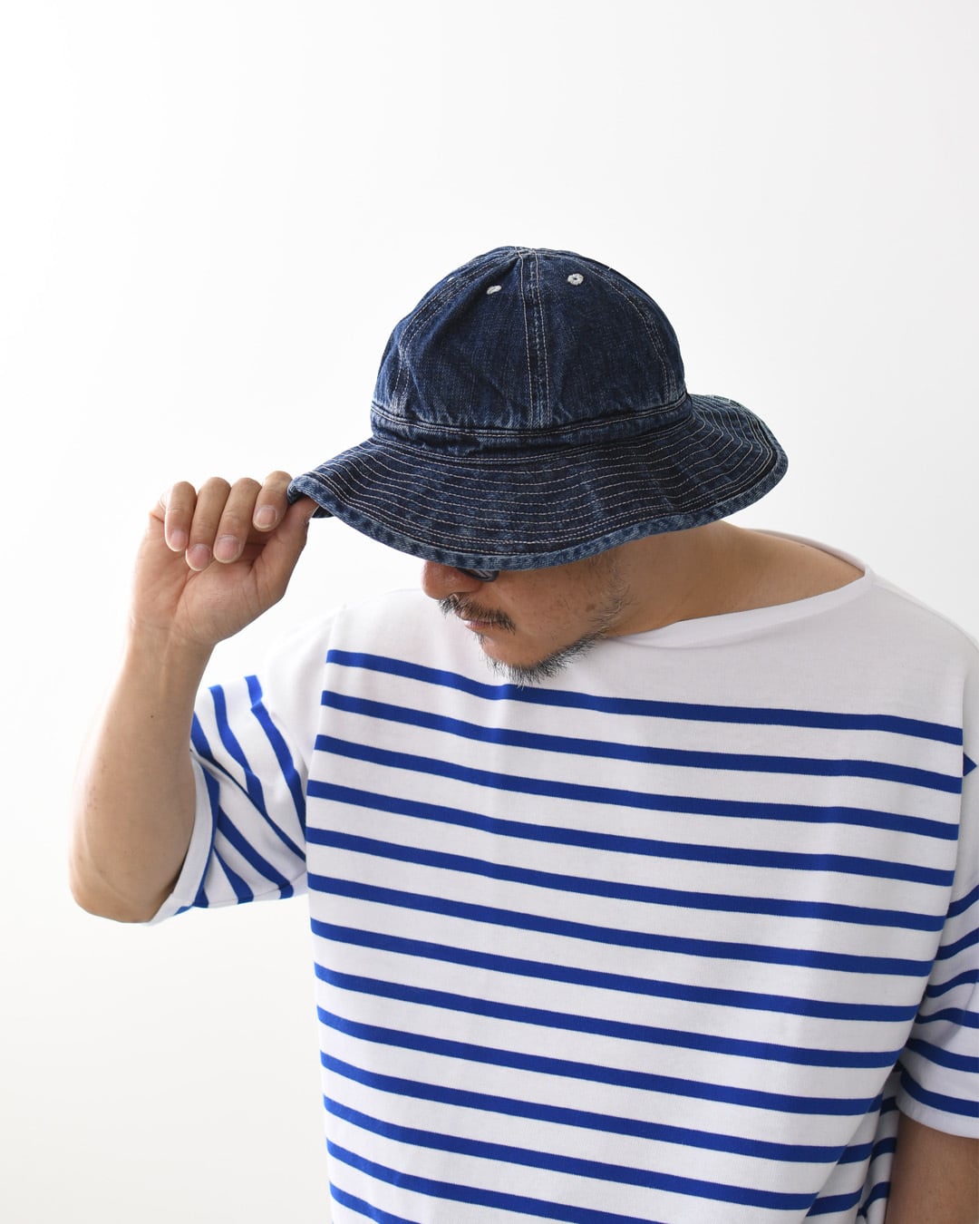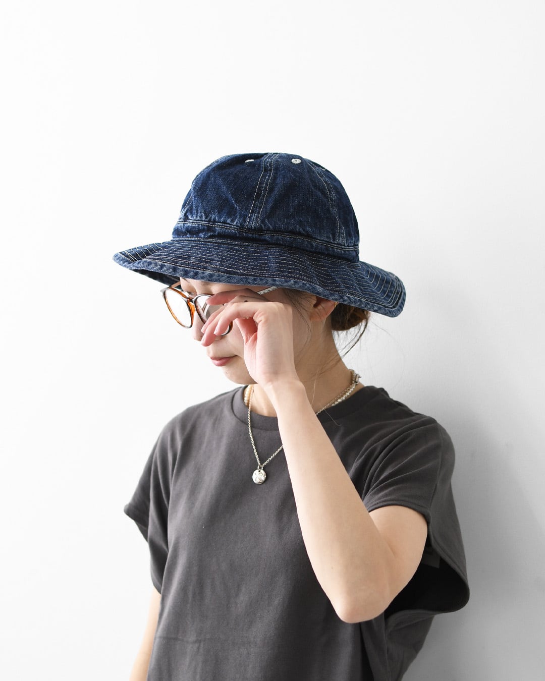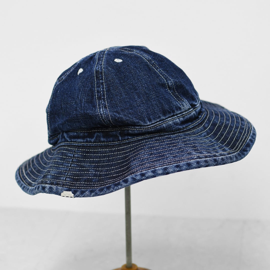 日差しをしっかりと遮る広めのブリムなど、実用性に基づいたディテールを踏襲しつつ、無骨な佇まいとデニムならではの風合いが絶妙に調和した一品です。