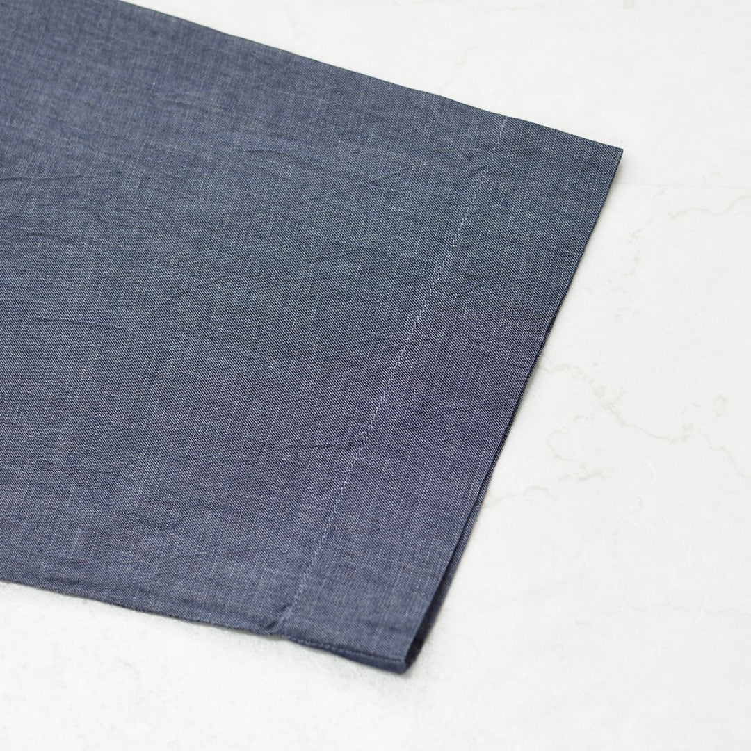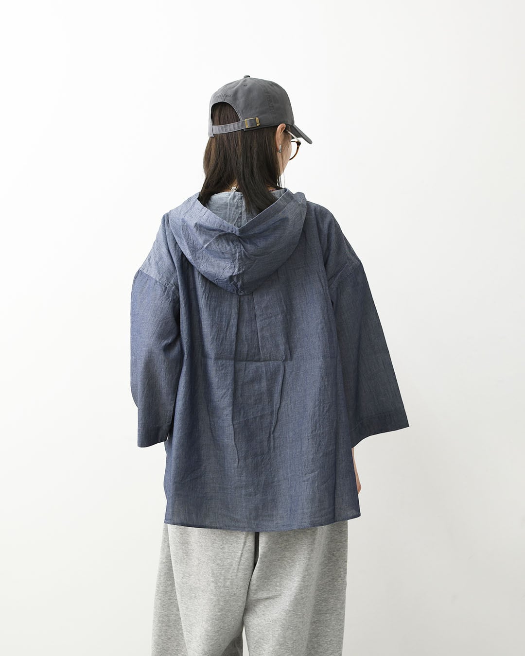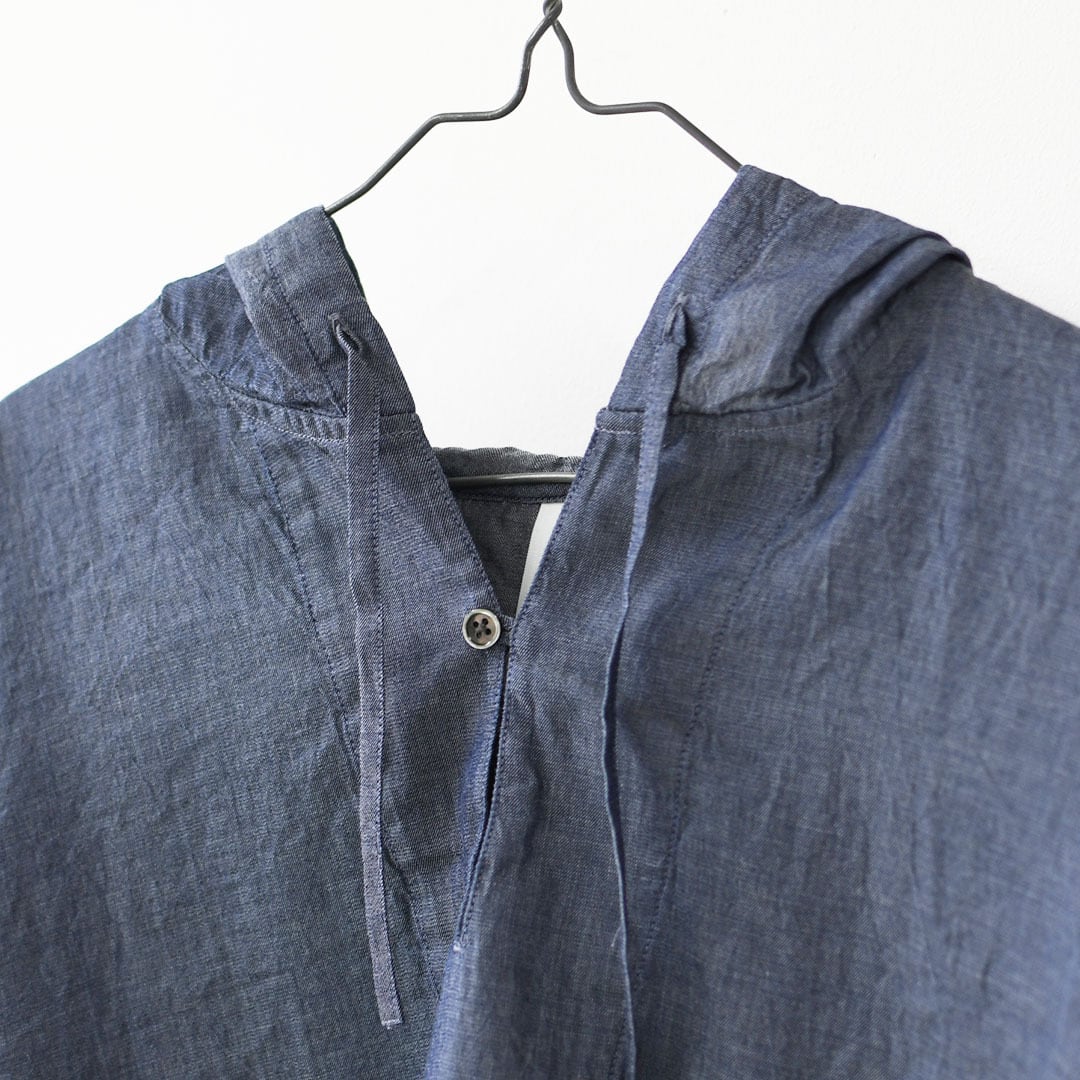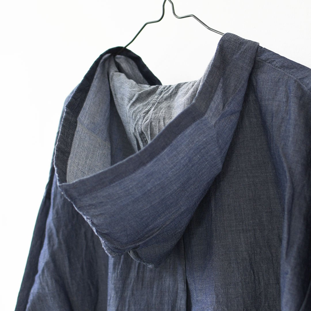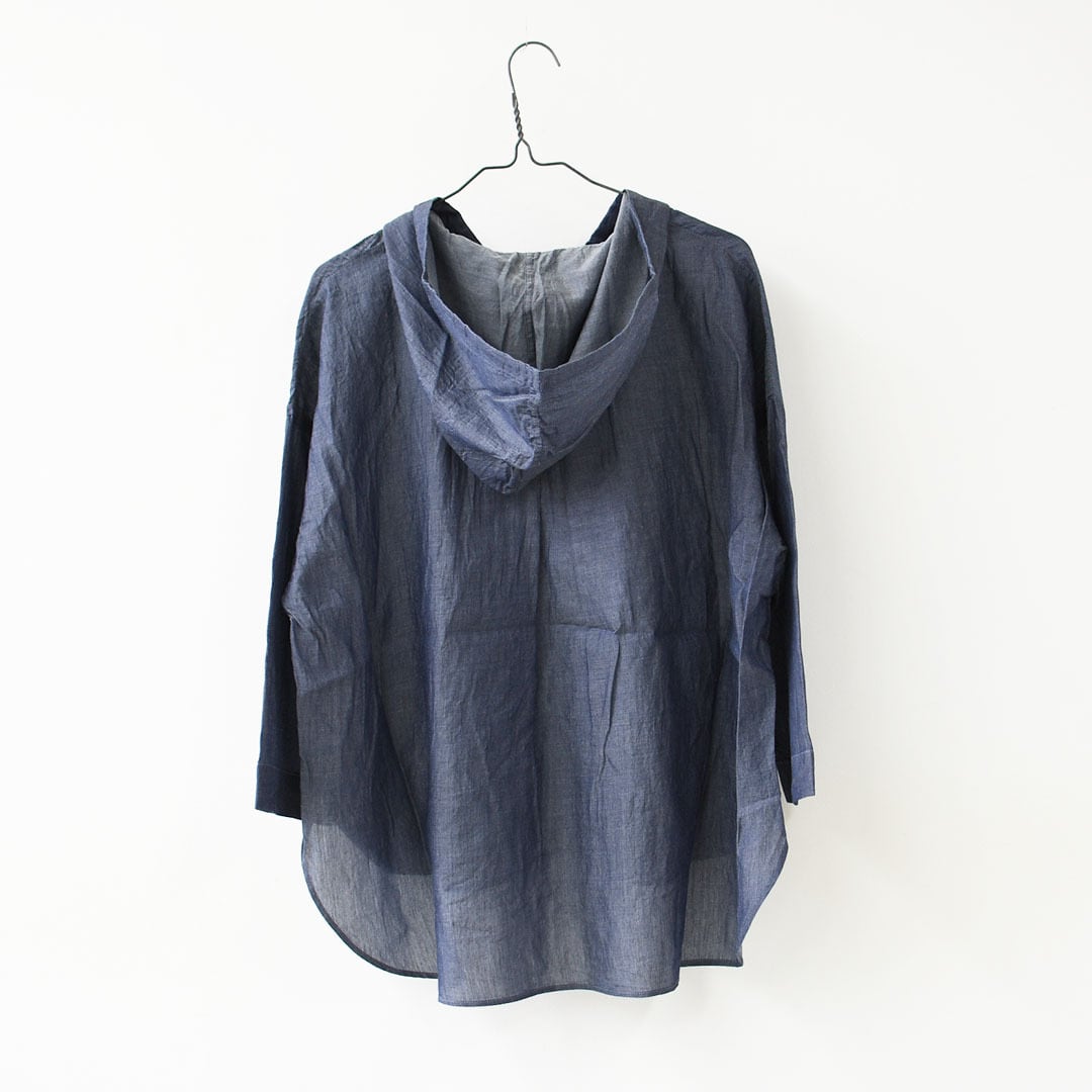 インディゴの深みある色合いと、ほんのり透ける軽やかな表情が魅力のフード付きプルオーバーシャツ。