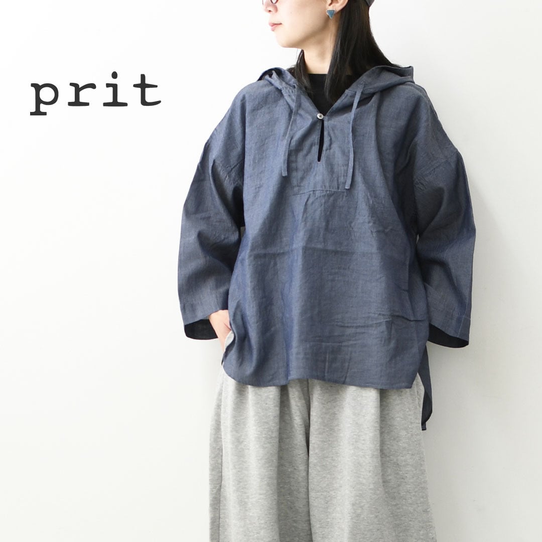 prit [プリット] インディゴシアーデニムフードプルオーバーシャツ [P82614] インディゴシャツ・フード付きシャツ・デニムブラウス・薄手デニム・シアーデニムシャツ・ワイドシルエット・ゆったりシルエット・LADY'S [2026SS]