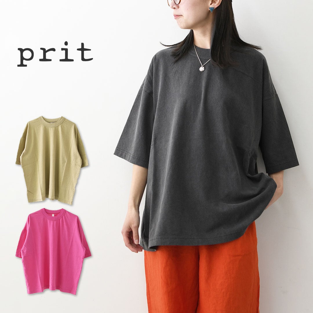 prit [プリット] 40/1引き揃え天竺ヴィンテージ加工5分袖クルーネックワイドTシャツ [P92617] 5分袖Tシャツ・ワイドTシャツ・オーバーサイズ・ゆったりサイズ・ドロップショルダー・羽織り・ノーカラー・LADY'S [2026SS]